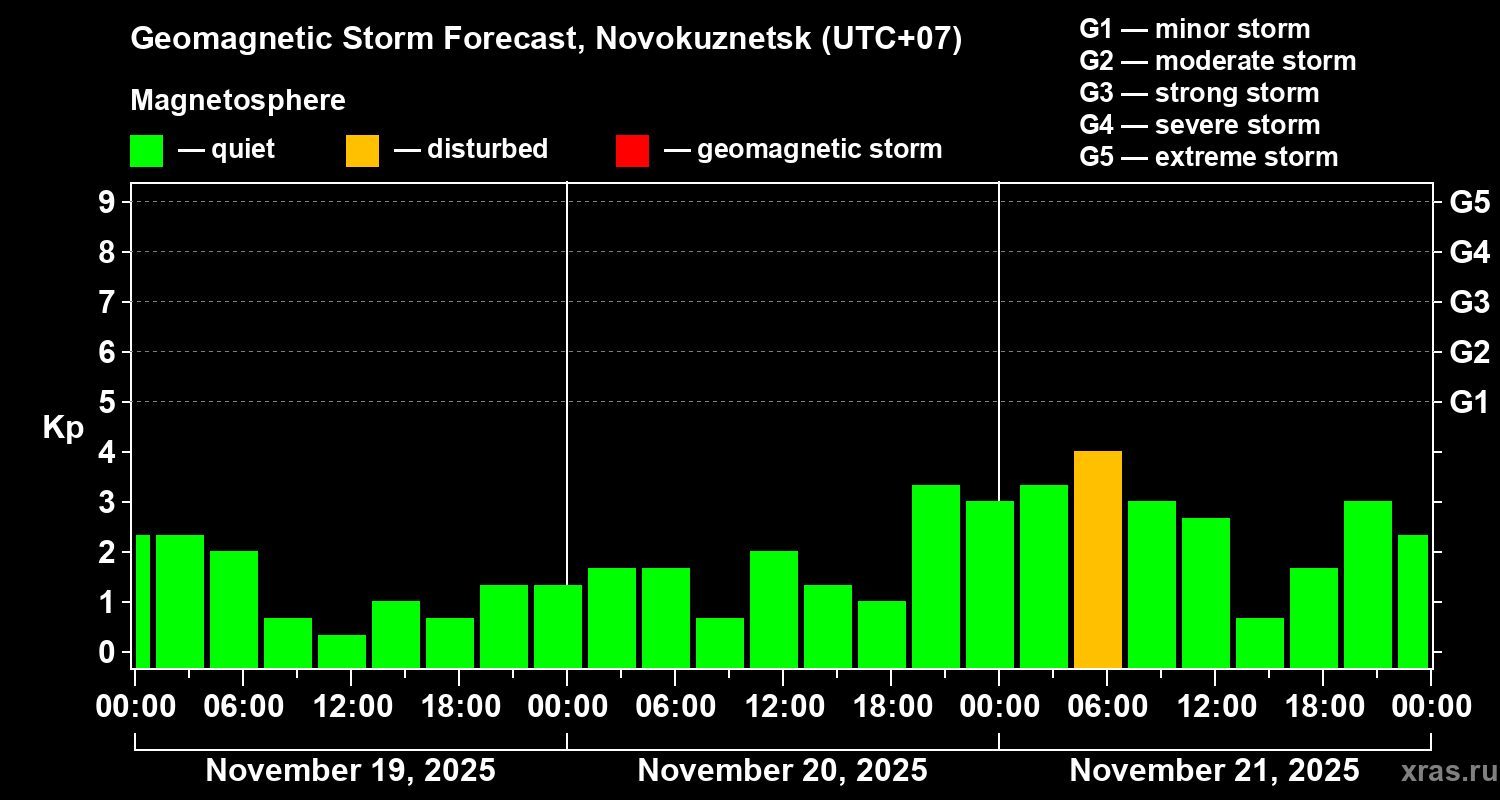 Geomagnetic storm forecast in Novokuznetsk for Nov 19, 2025
