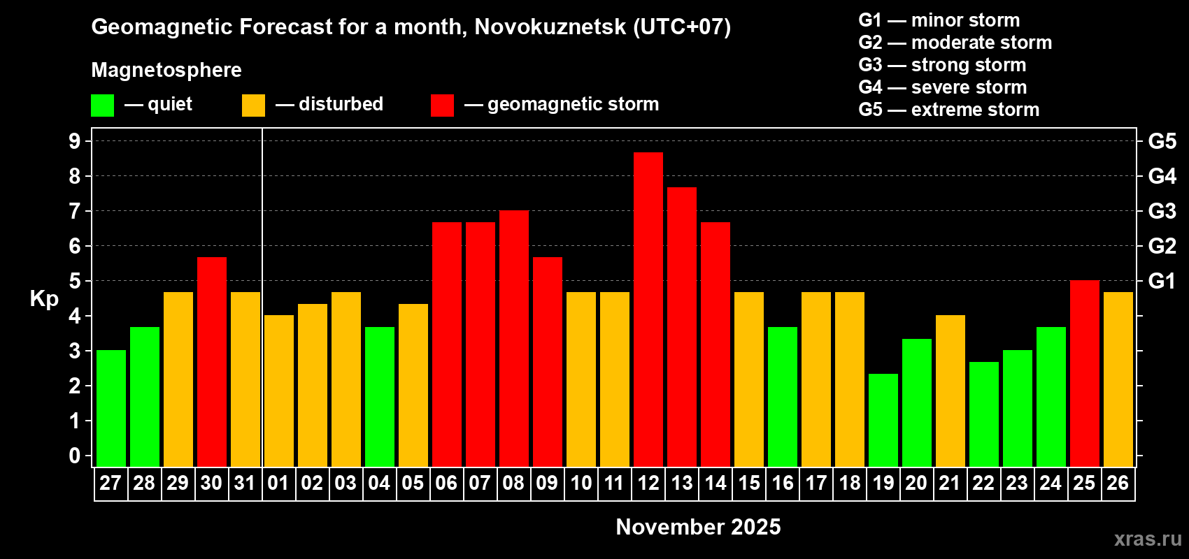 Geomagnetic storm forecast in Novokuznetsk for Oct 27, 2025