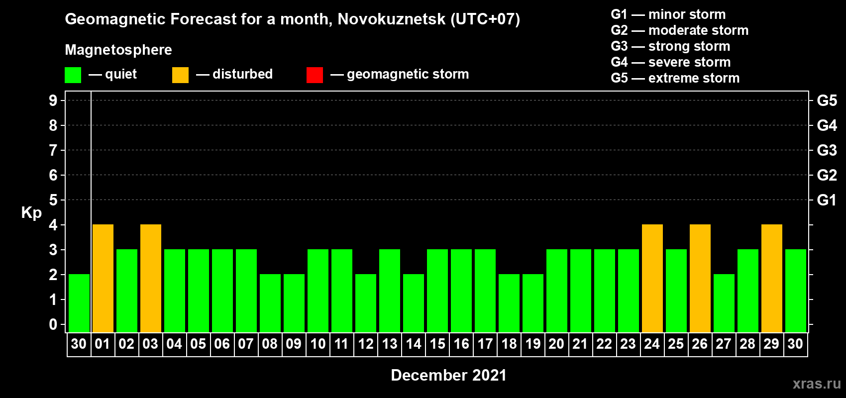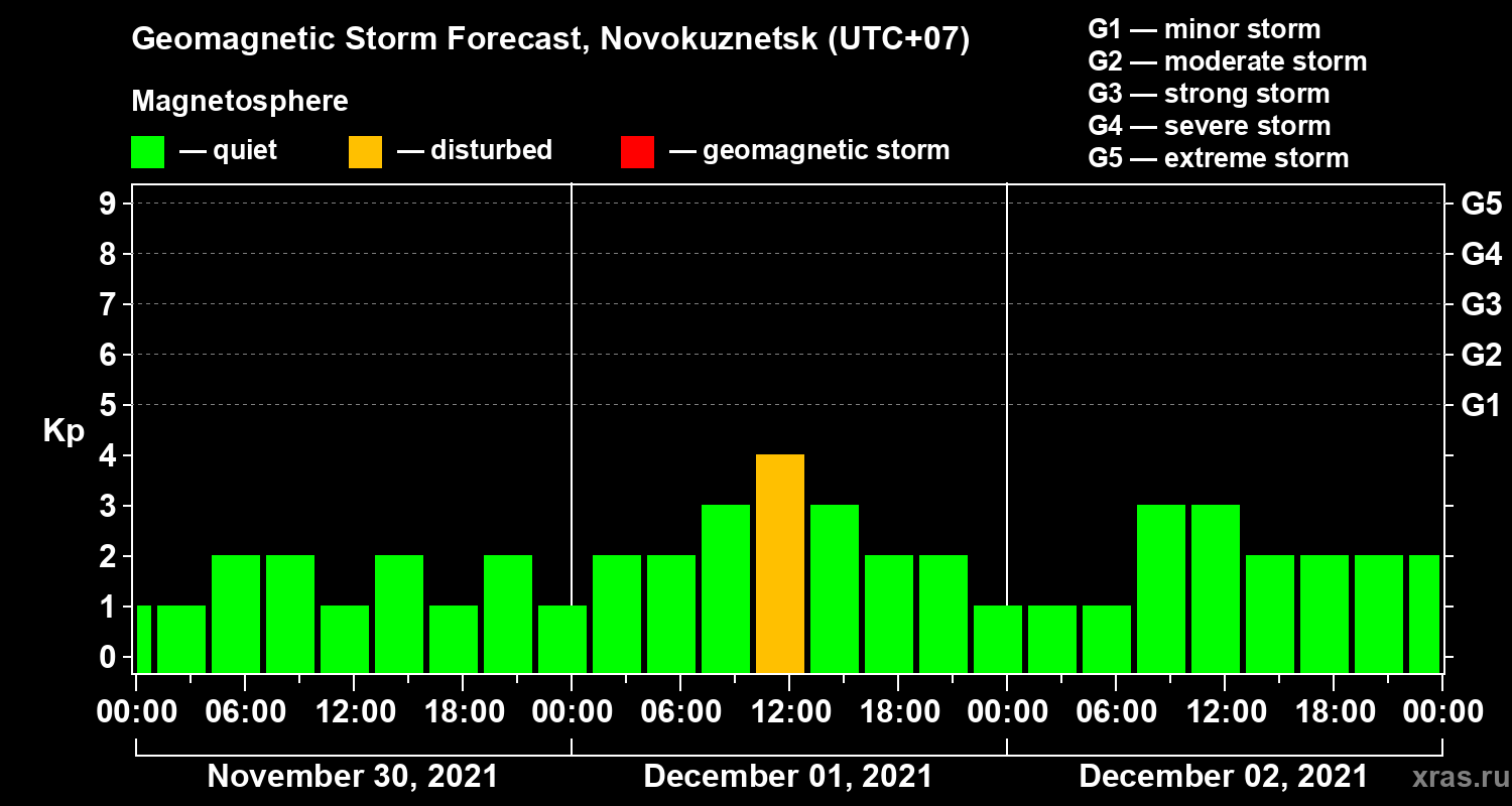 Geomagnetic storm forecast in Novokuznetsk for Nov 30, 2021