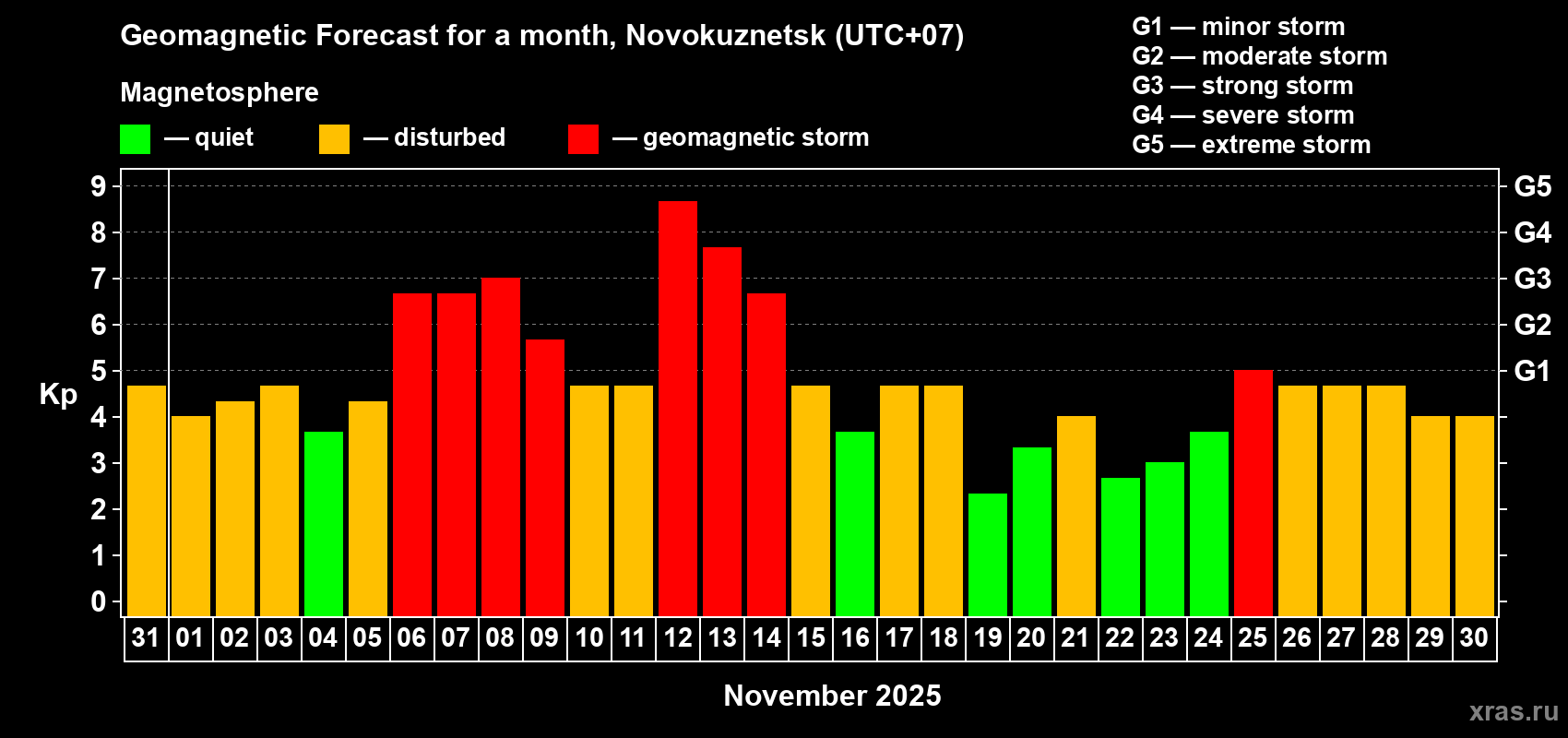 Geomagnetic storm forecast in Novokuznetsk for Oct 31, 2025