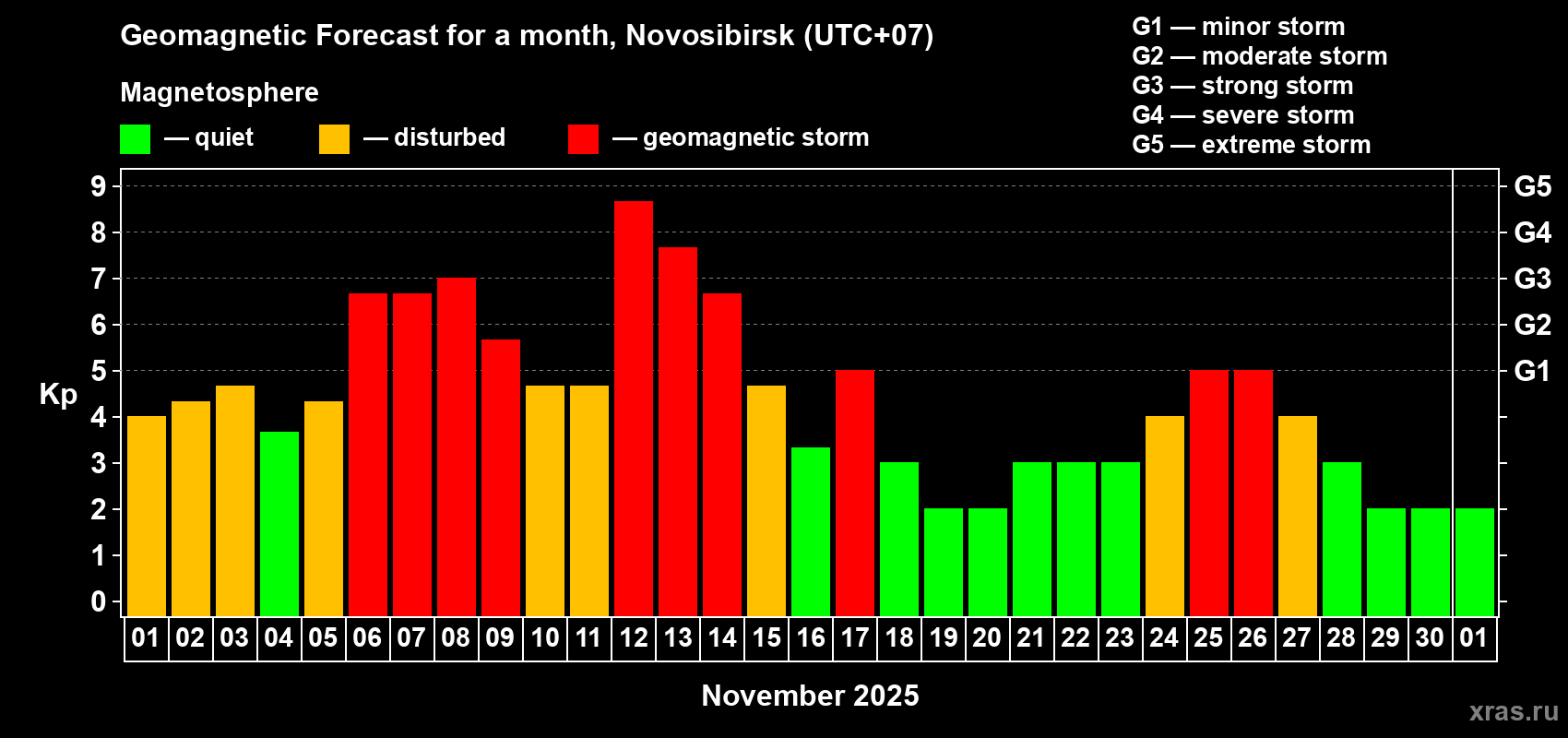 Geomagnetic storm forecast in Novosibirsk for Nov 01, 2025