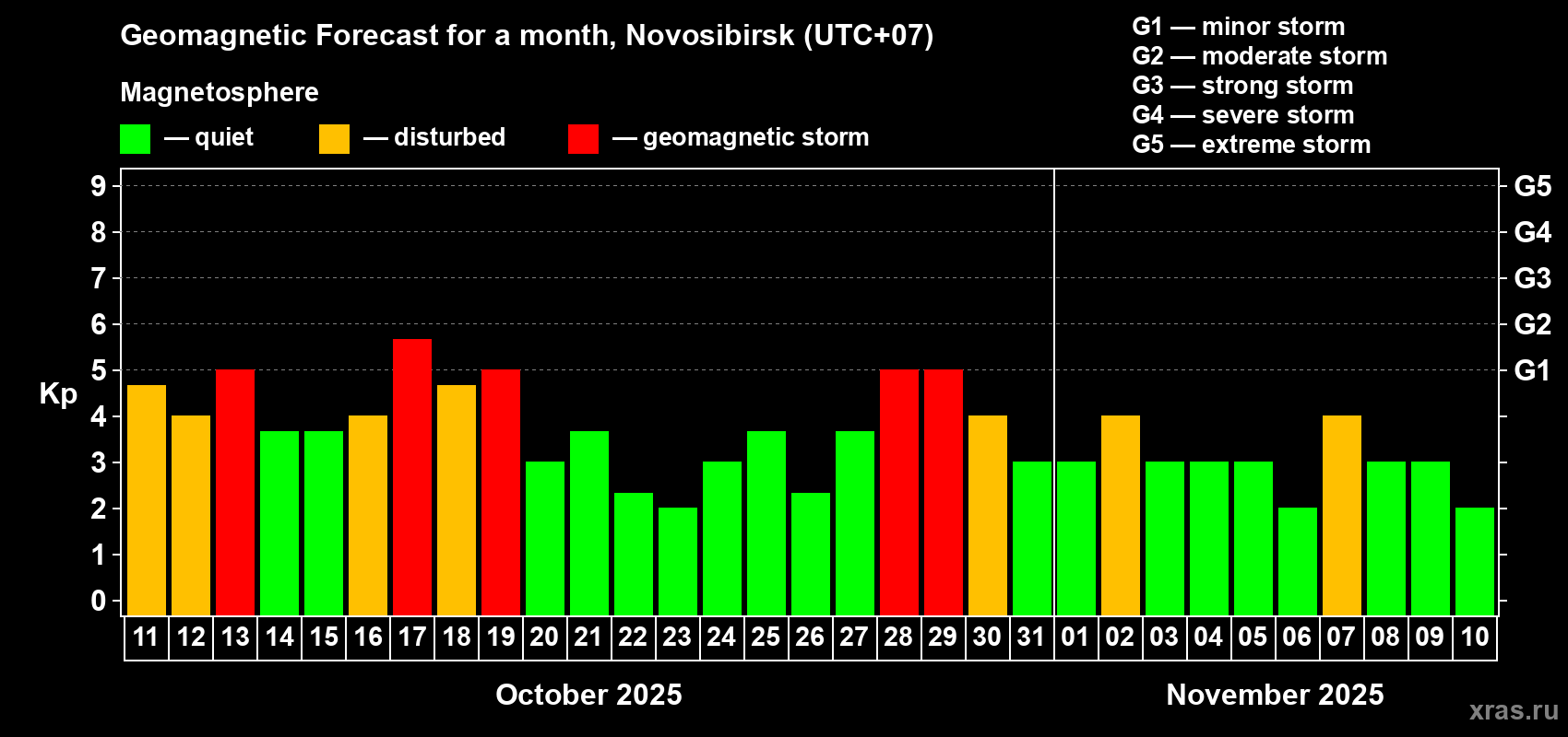 Geomagnetic storm forecast in Novosibirsk for Oct 11, 2025