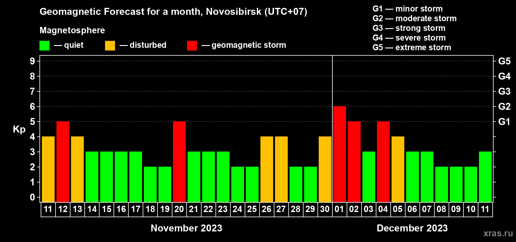 Geomagnetic storm forecast in Novosibirsk for Nov 11, 2023