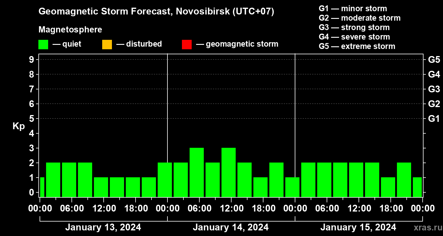 Geomagnetic storm forecast in Novosibirsk for Jan 13, 2024