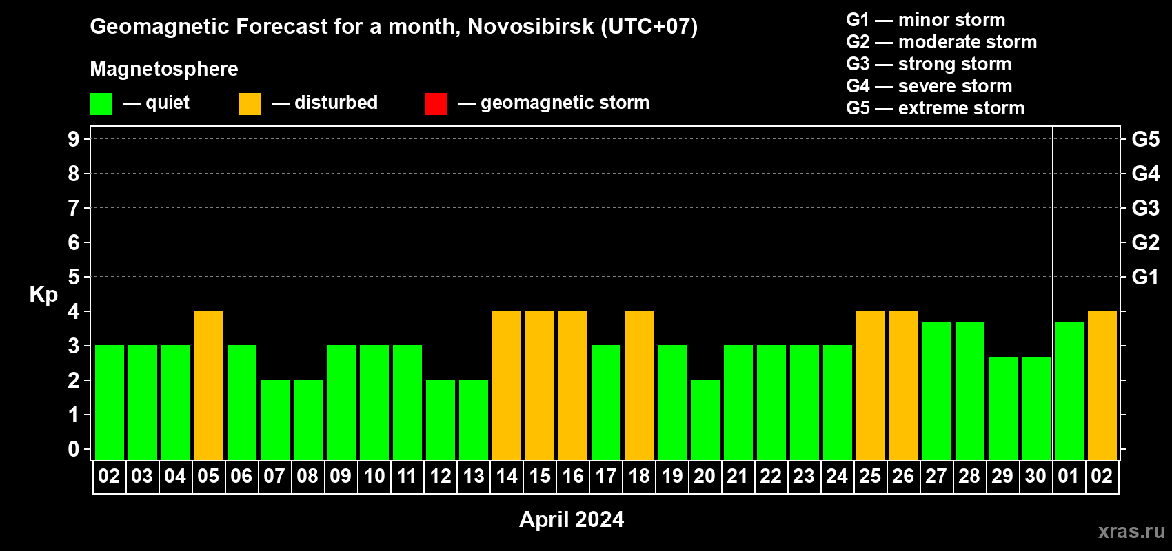Geomagnetic storm forecast in Novosibirsk for Apr 02, 2024