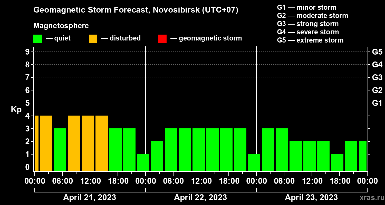 Geomagnetic storm forecast in Novosibirsk for Apr 21, 2023