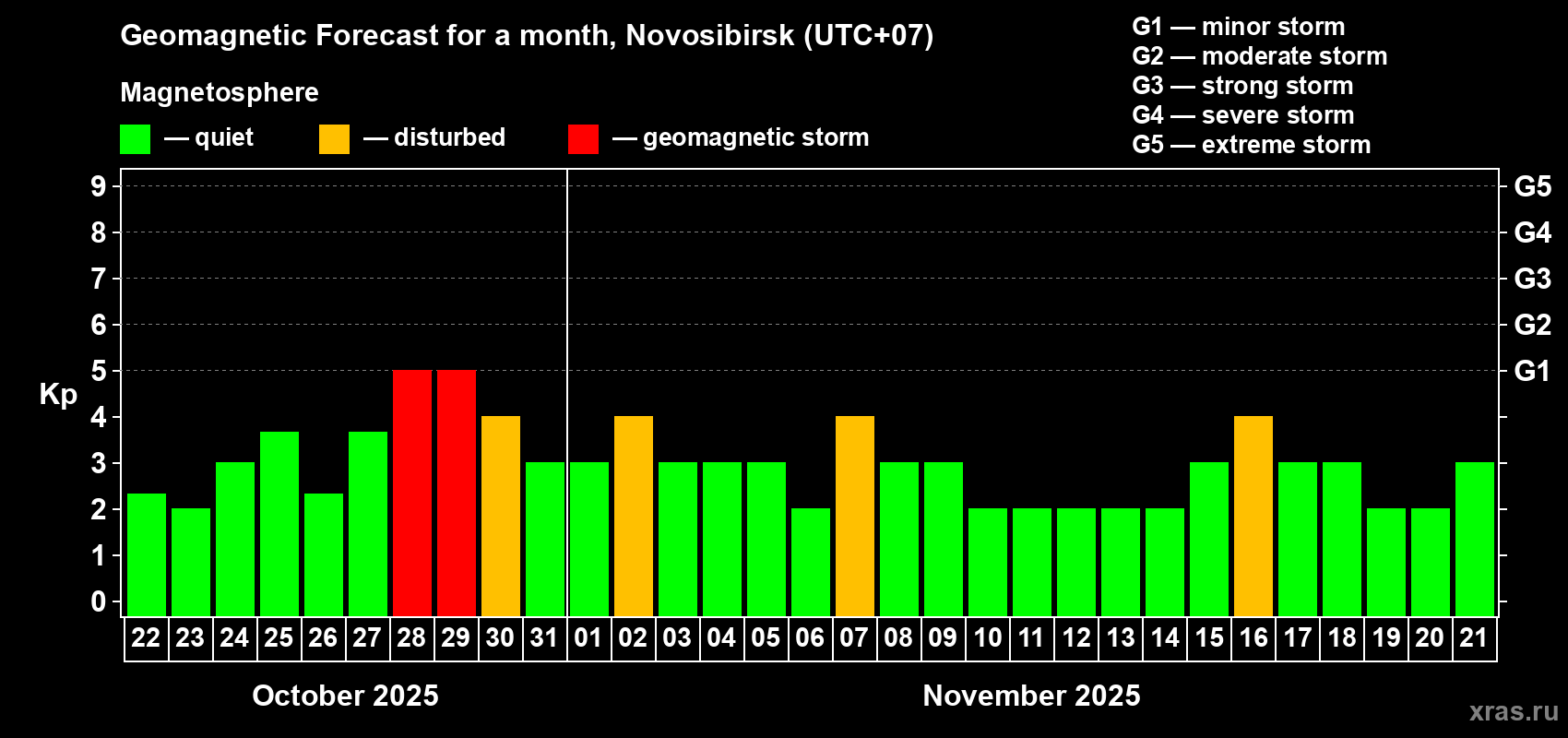 Geomagnetic storm forecast in Novosibirsk for Oct 22, 2025