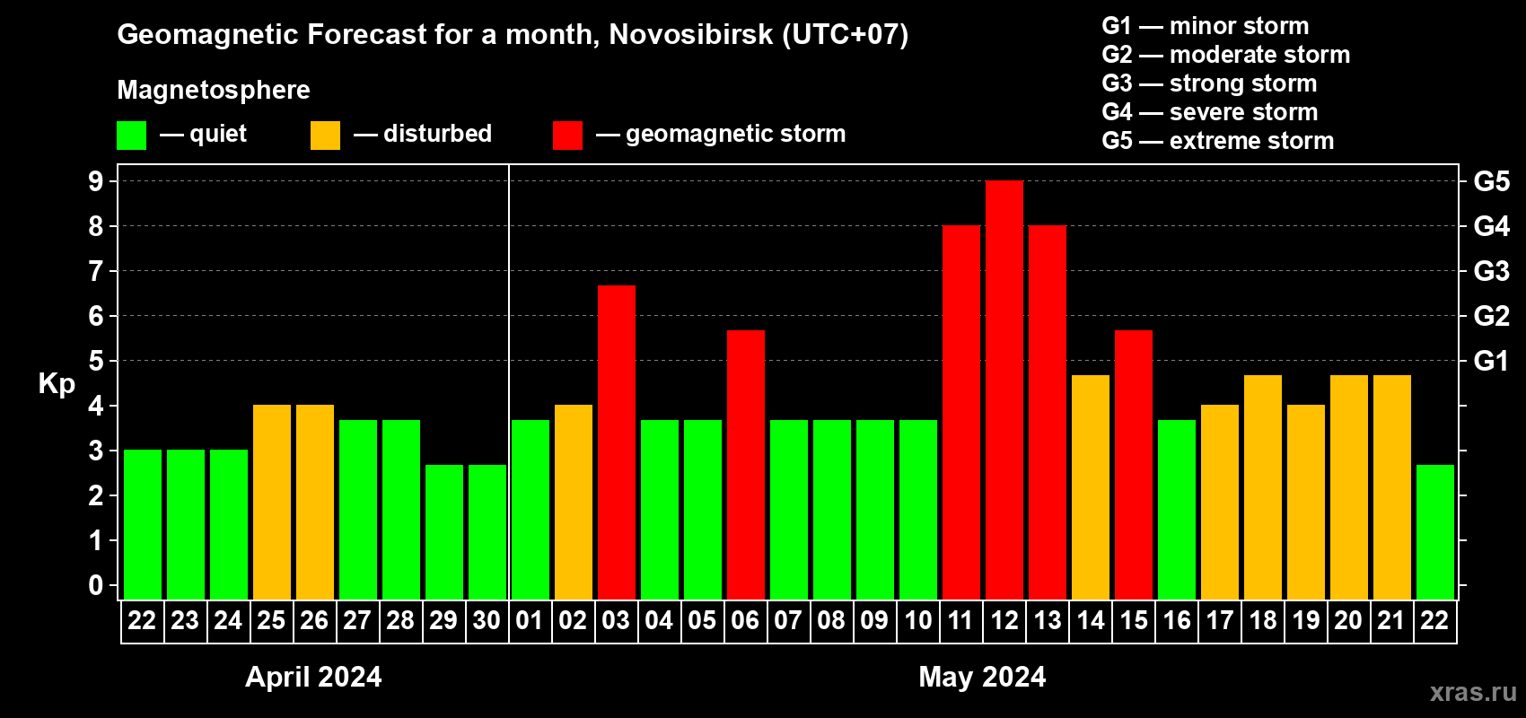 Geomagnetic storm forecast in Novosibirsk for Apr 22, 2024