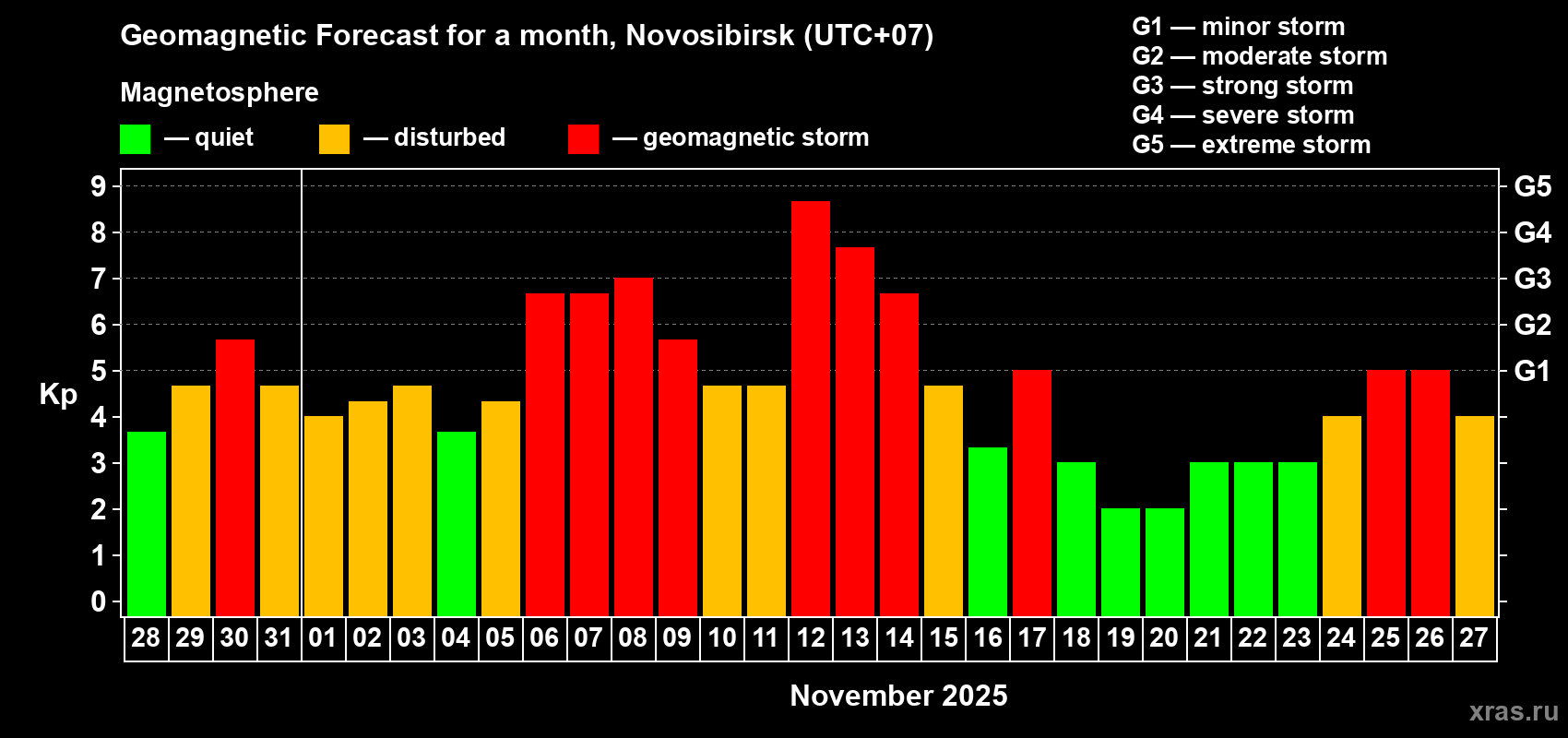 Geomagnetic storm forecast in Novosibirsk for Oct 28, 2025