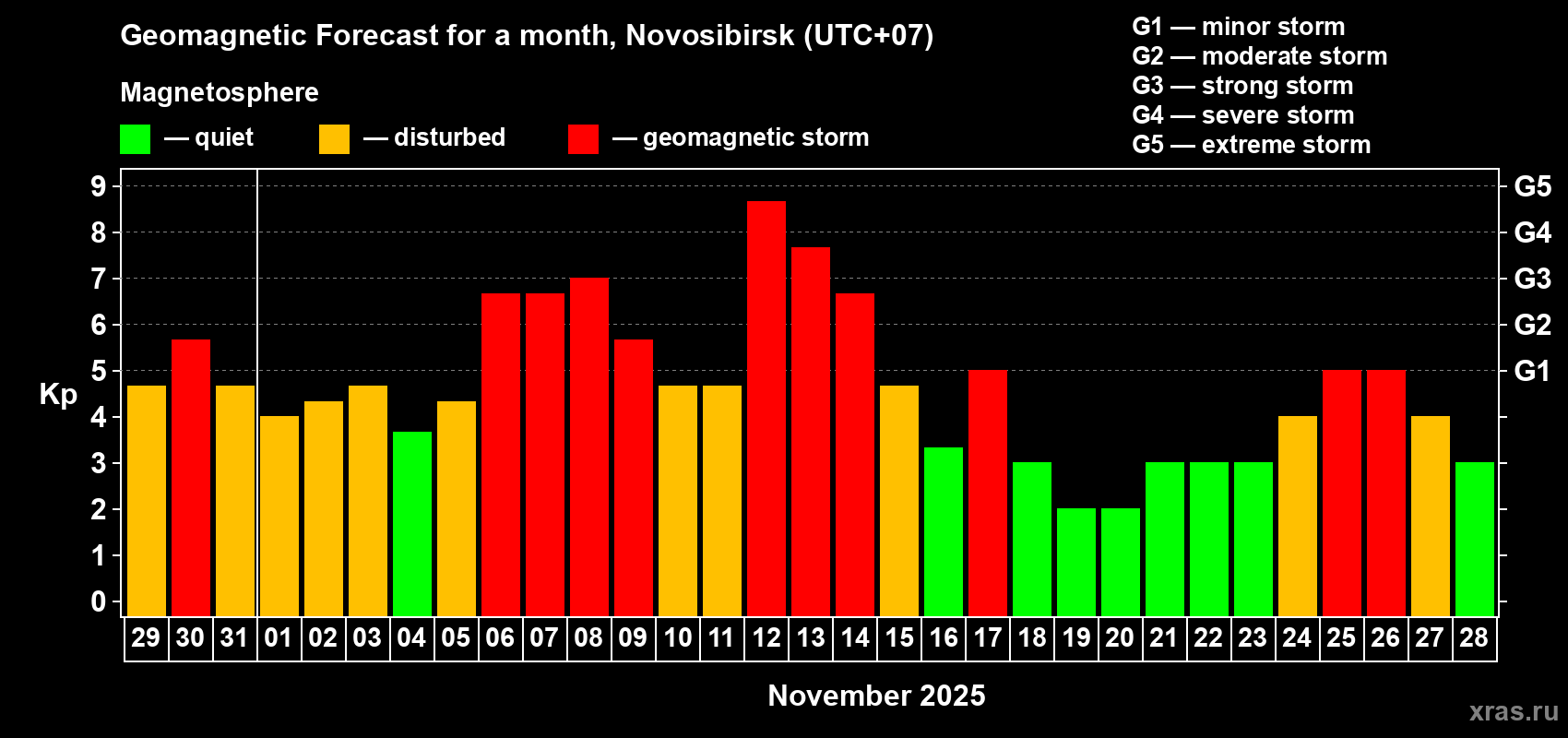 Geomagnetic storm forecast in Novosibirsk for Oct 29, 2025