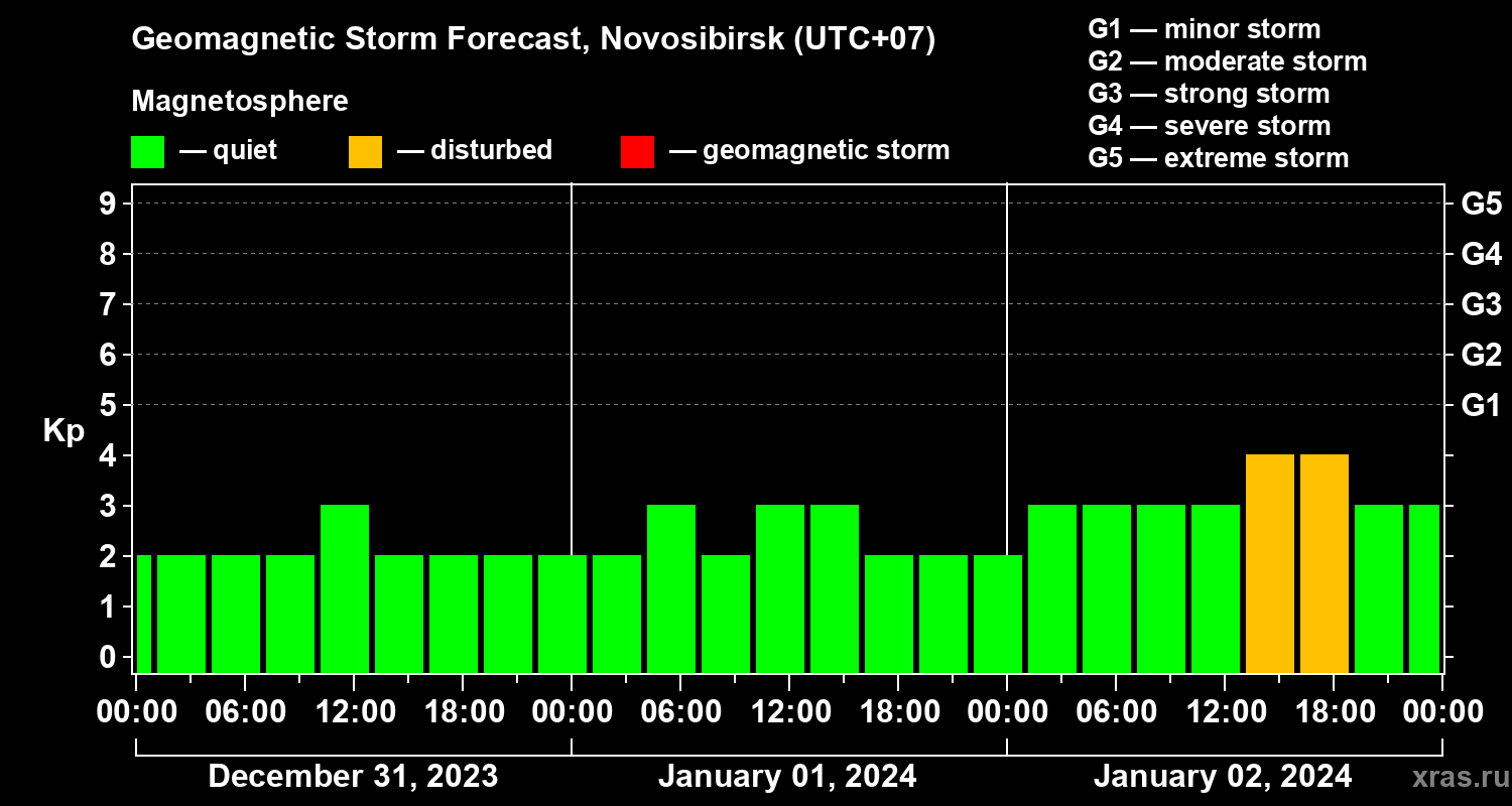 Geomagnetic storm forecast in Novosibirsk for Dec 31, 2023