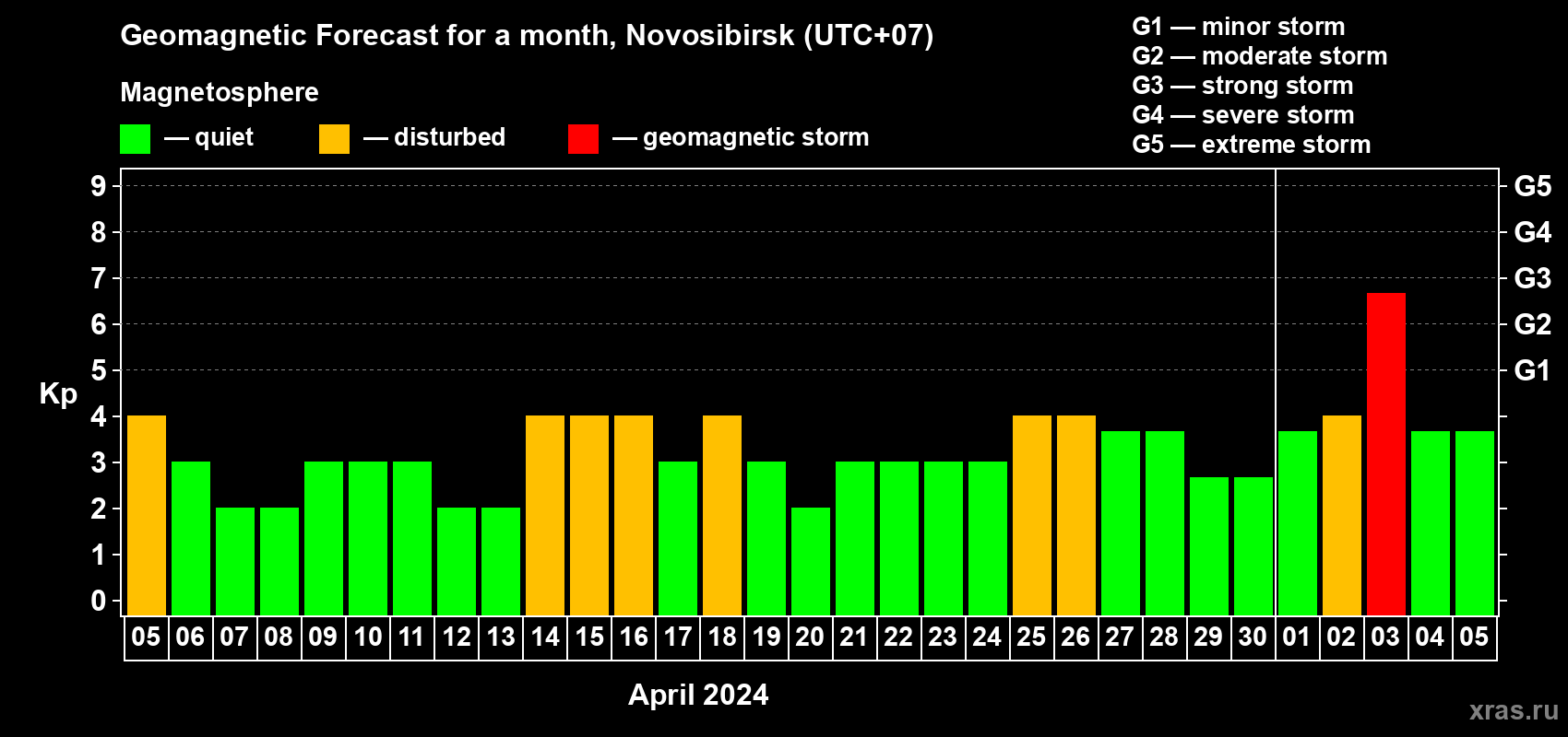 Geomagnetic storm forecast in Novosibirsk for Apr 05, 2024