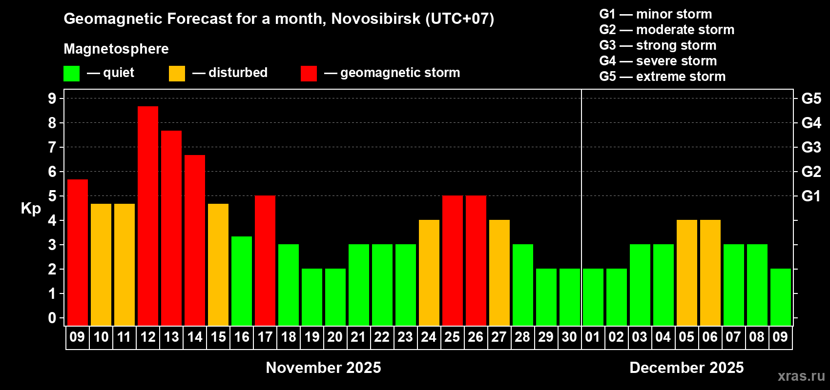 Geomagnetic storm forecast in Novosibirsk for Nov 09, 2025