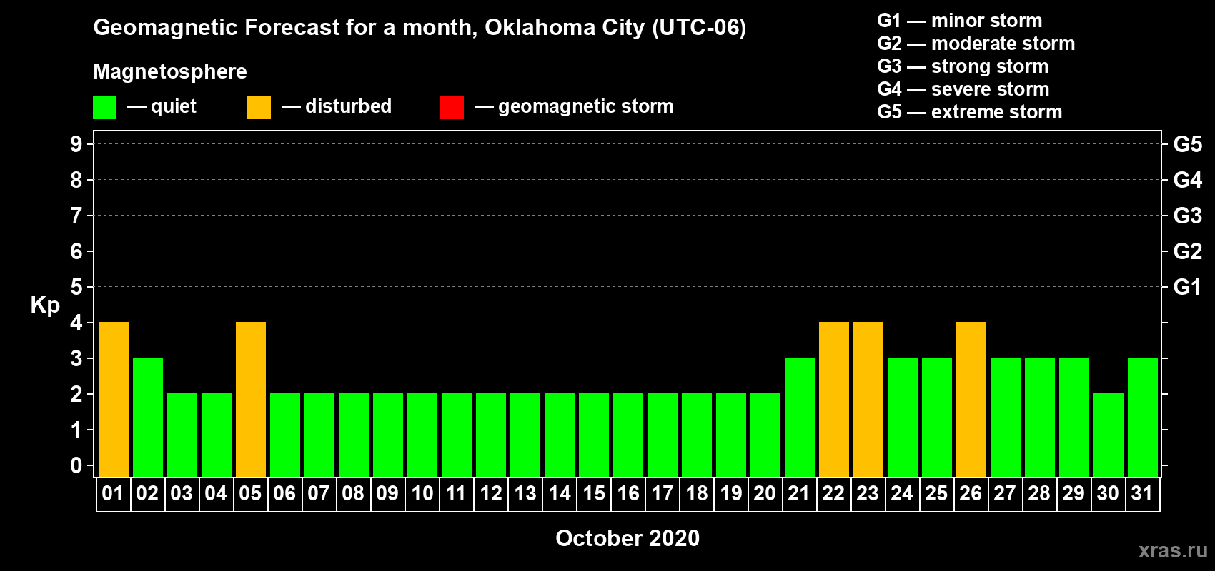 Geomagnetic storm forecast in Oklahoma City for Oct 01, 2020
