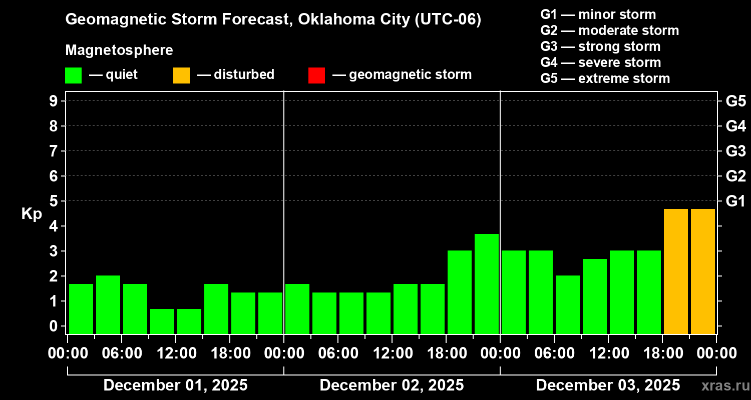 Geomagnetic storm forecast in Oklahoma City for Dec 01, 2025