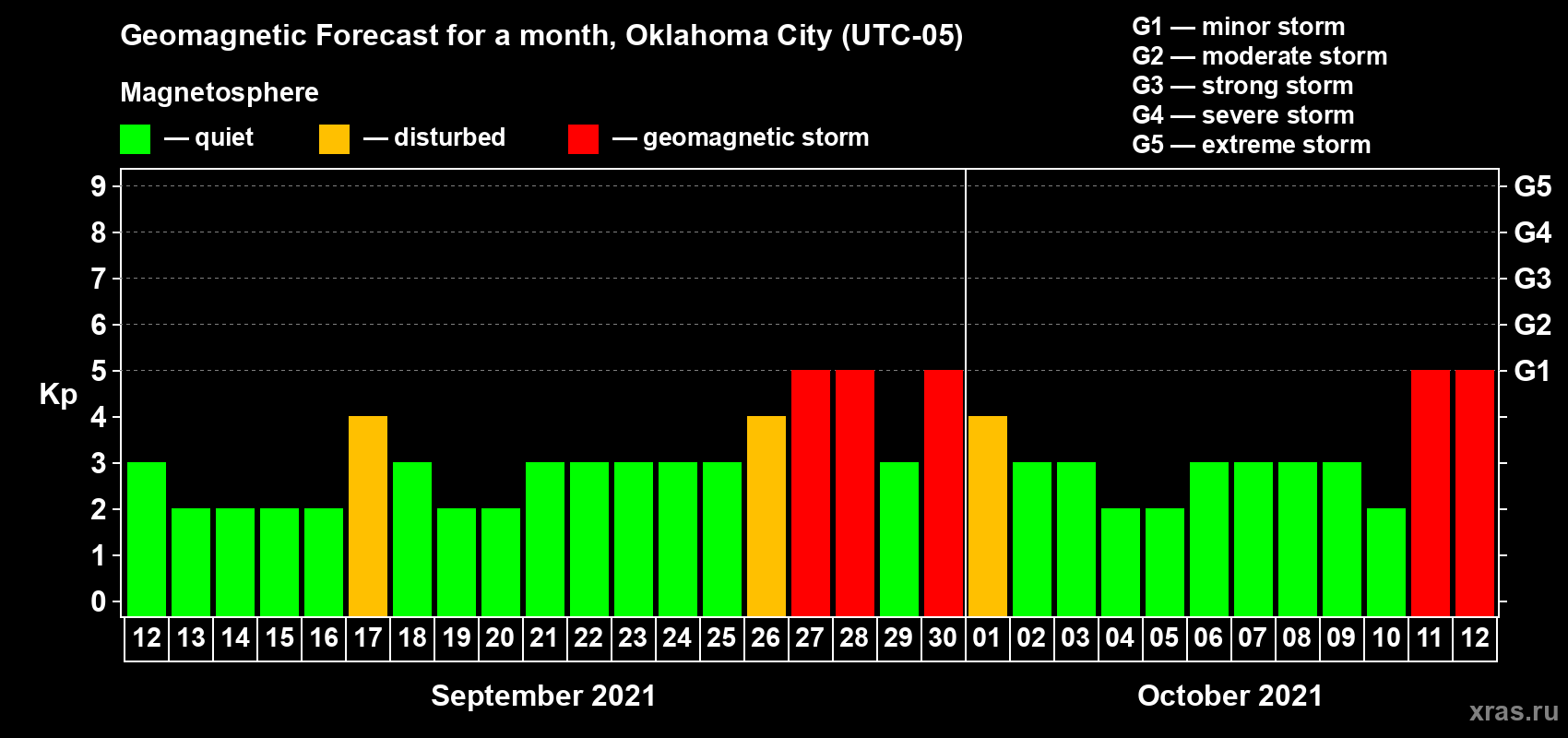 Geomagnetic storm forecast in Oklahoma City for Sep 12, 2021