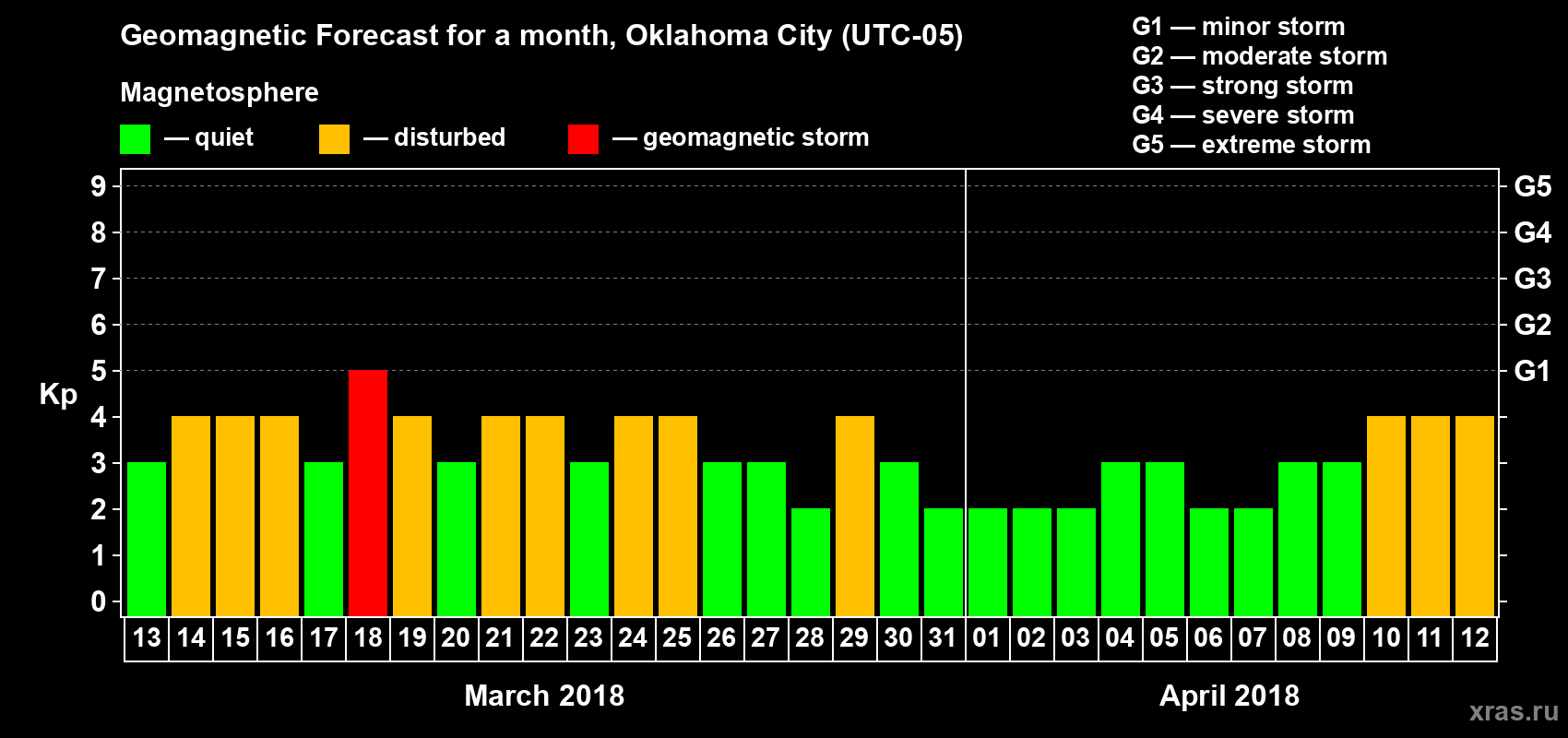 Geomagnetic storm forecast in Oklahoma City for Mar 13, 2018