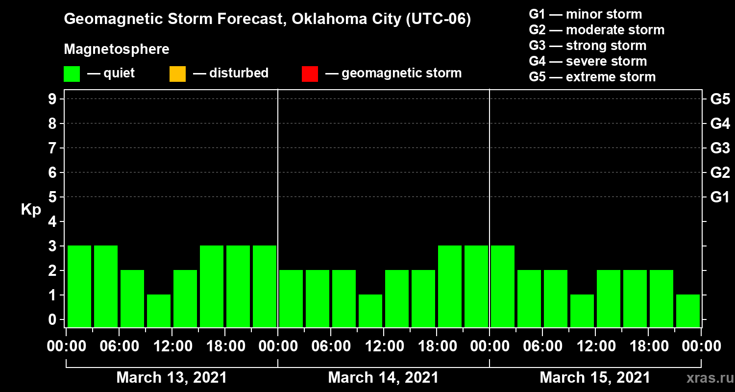 Geomagnetic storm forecast in Oklahoma City for Mar 13, 2021