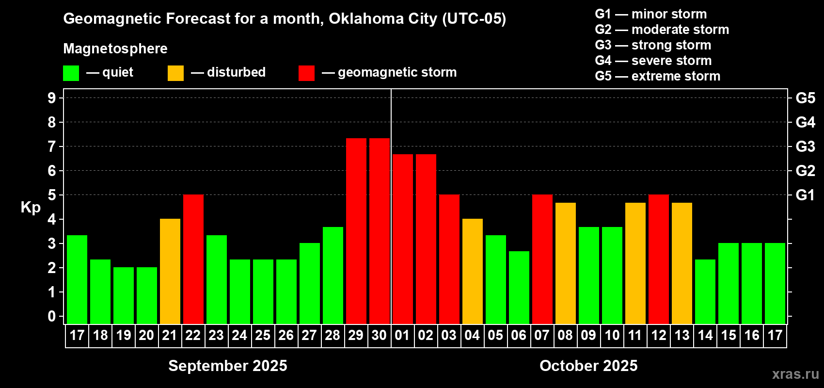 Geomagnetic storm forecast in Oklahoma City for Sep 17, 2025