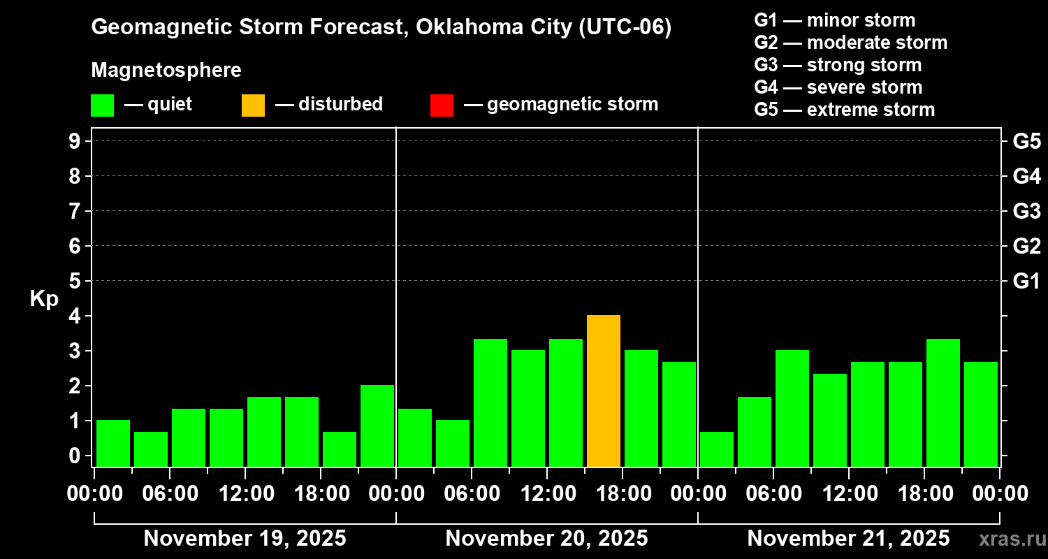 Geomagnetic storm forecast in Oklahoma City for Nov 19, 2025
