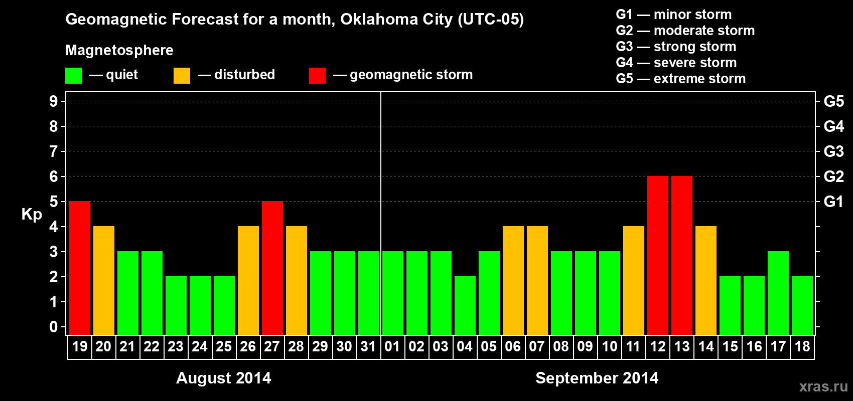 Geomagnetic storm forecast in Oklahoma City for Aug 19, 2014