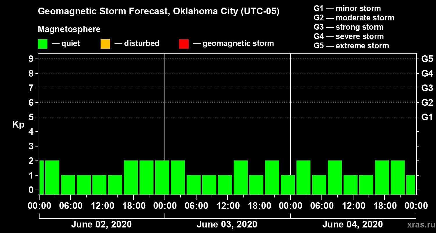 Geomagnetic storm forecast in Oklahoma City for Jun 02, 2020
