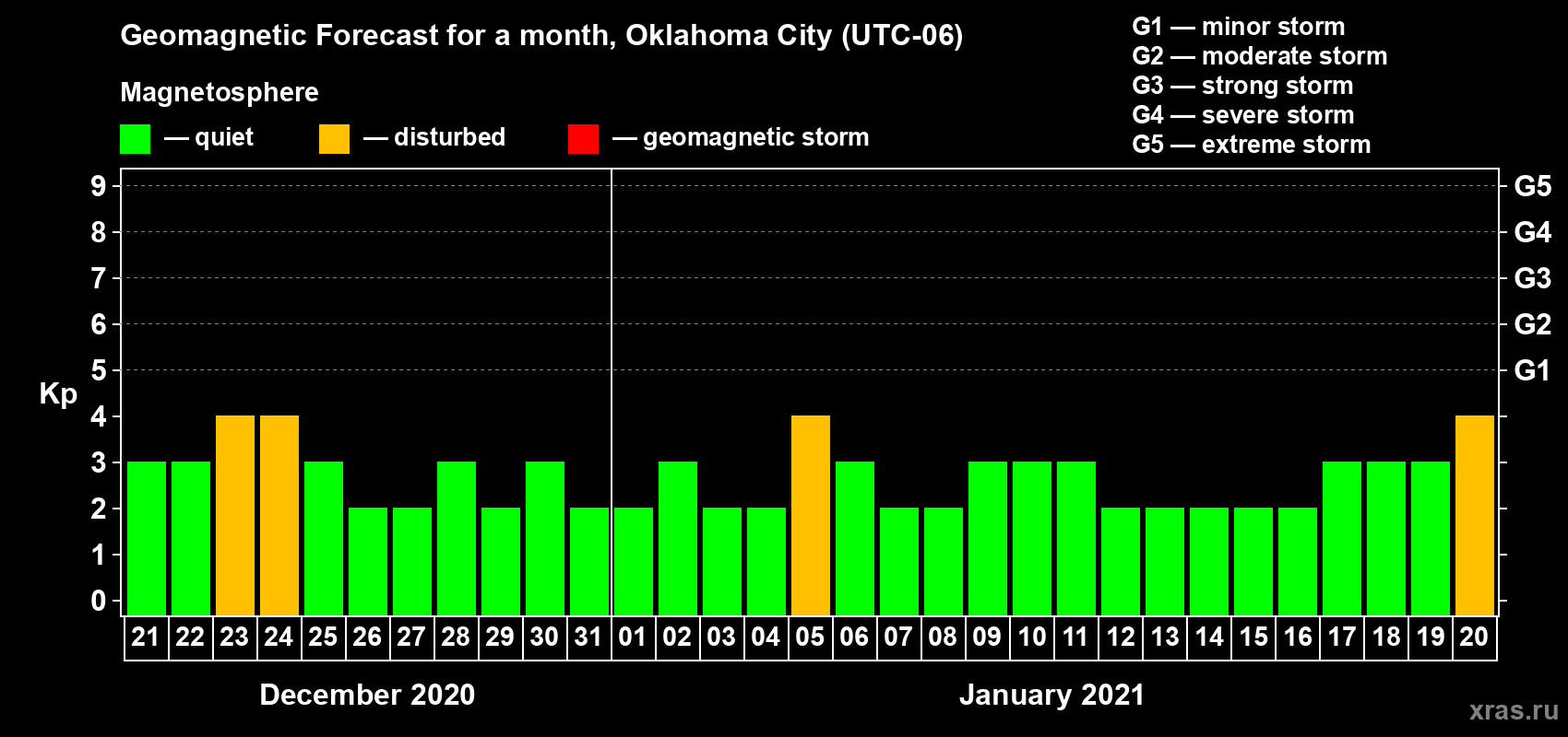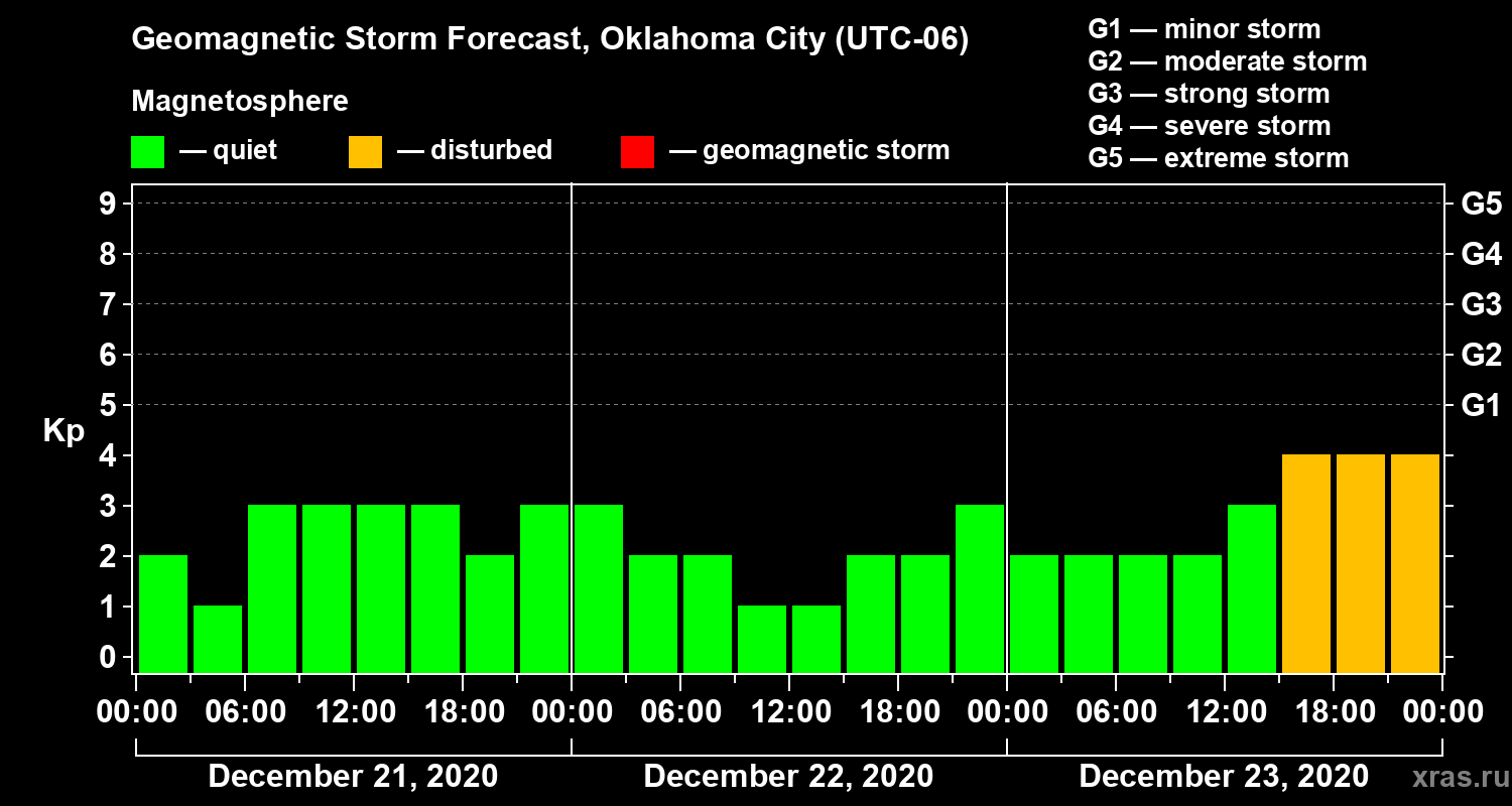 Geomagnetic storm forecast in Oklahoma City for Dec 21, 2020