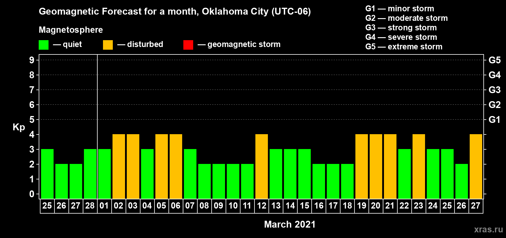 Geomagnetic storm forecast in Oklahoma City for Feb 25, 2021