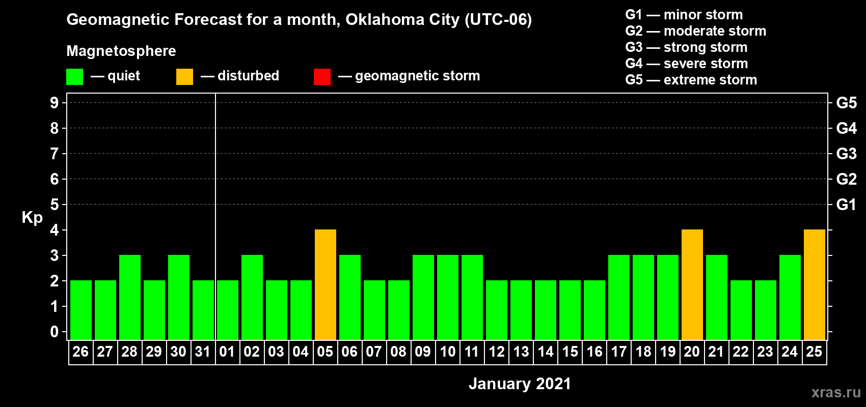 Geomagnetic storm forecast in Oklahoma City for Dec 26, 2020