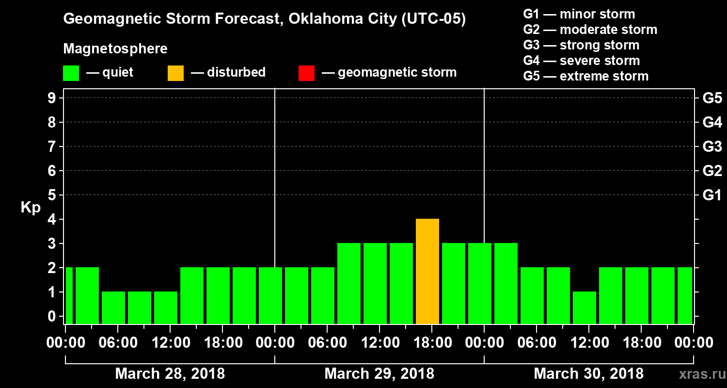 Geomagnetic storm forecast in Oklahoma City for Mar 28, 2018