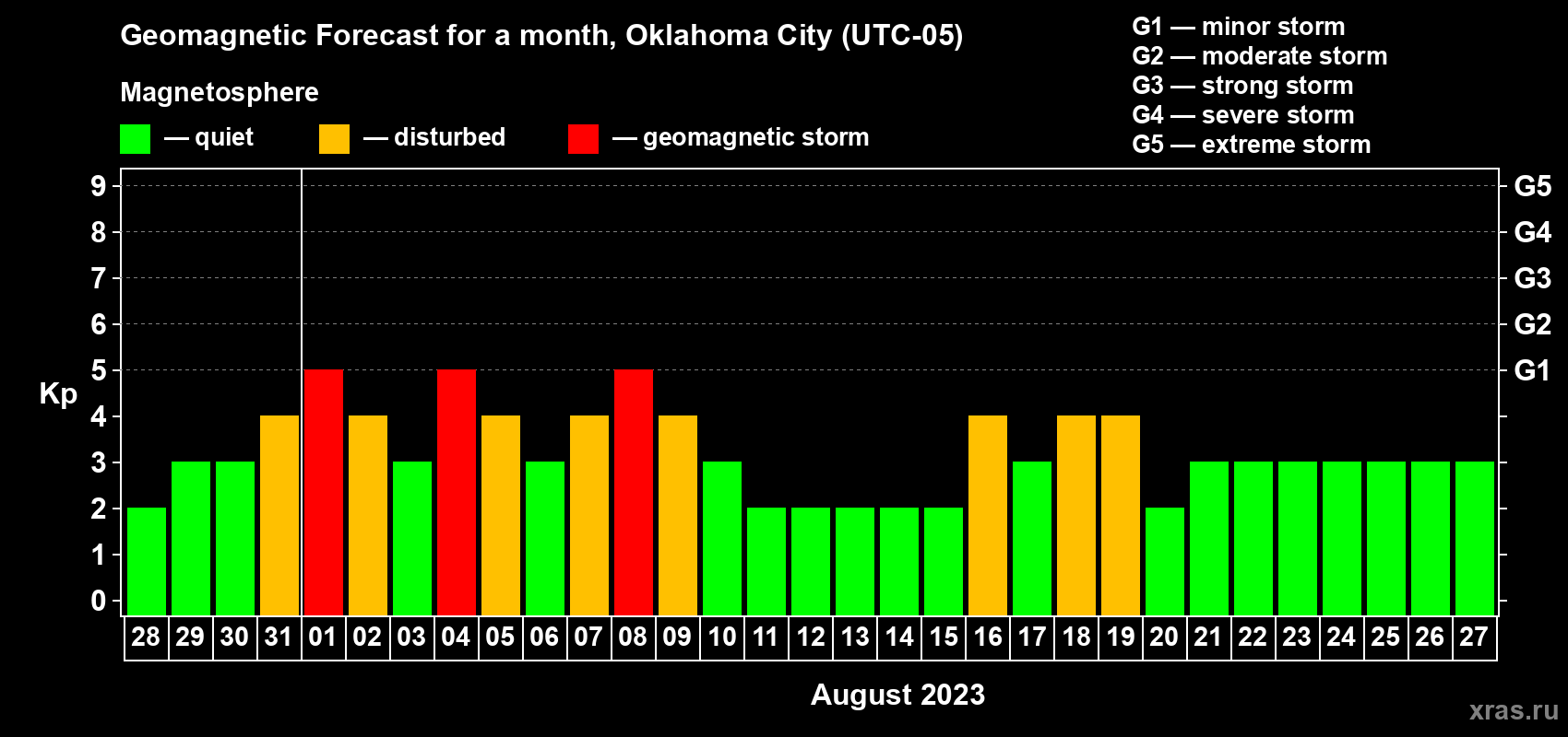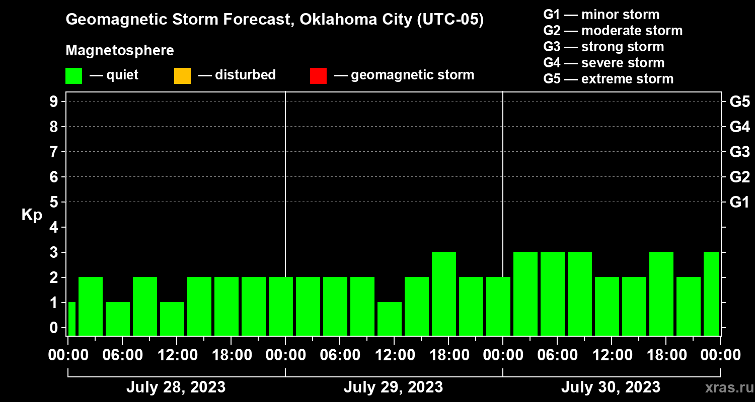 Geomagnetic storm forecast in Oklahoma City for Jul 28, 2023