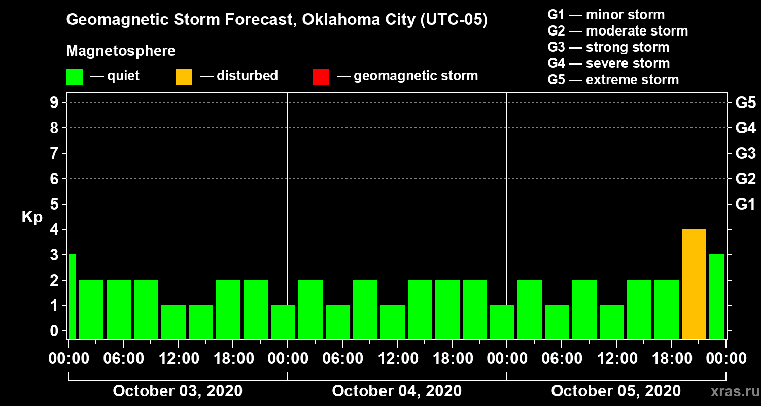 Geomagnetic storm forecast in Oklahoma City for Oct 03, 2020