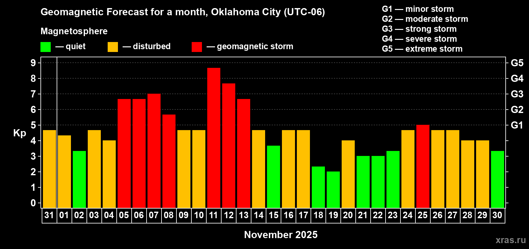 Geomagnetic storm forecast in Oklahoma City for Oct 31, 2025