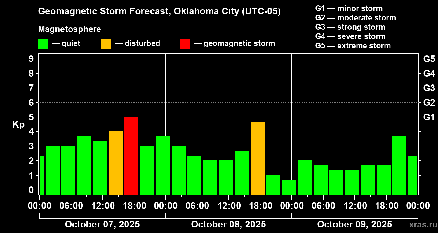 Geomagnetic storm forecast in Oklahoma City for Oct 07, 2025