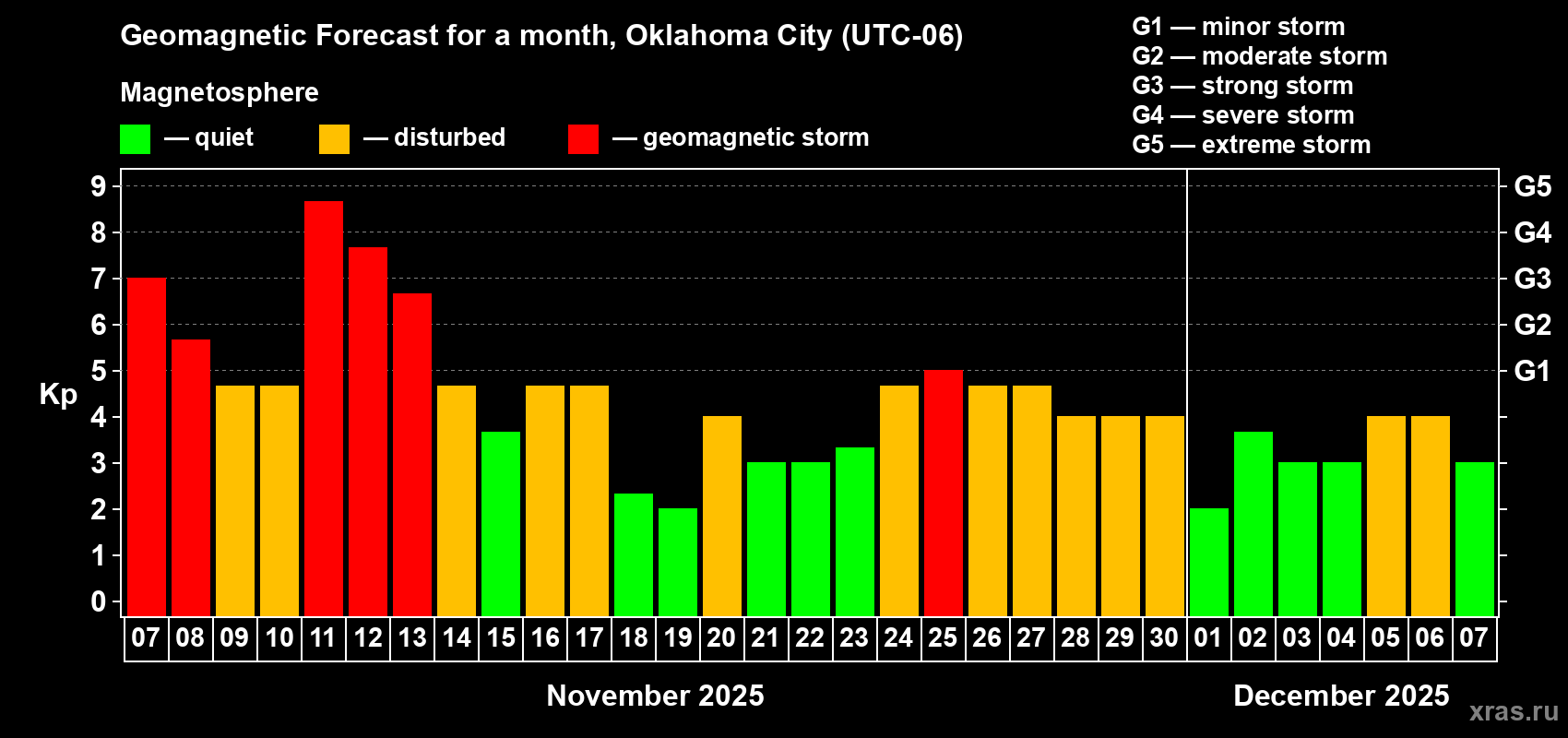 Geomagnetic storm forecast in Oklahoma City for Nov 07, 2025
