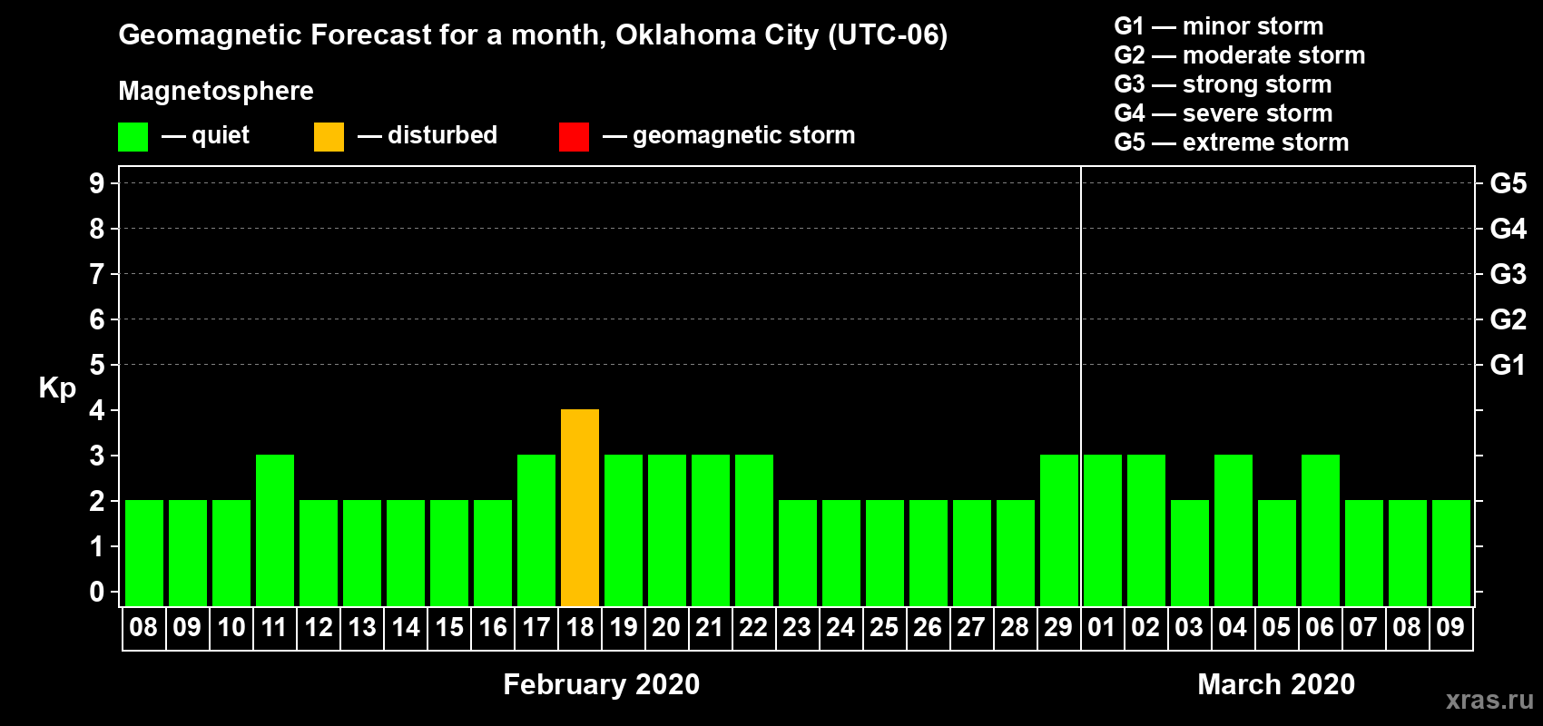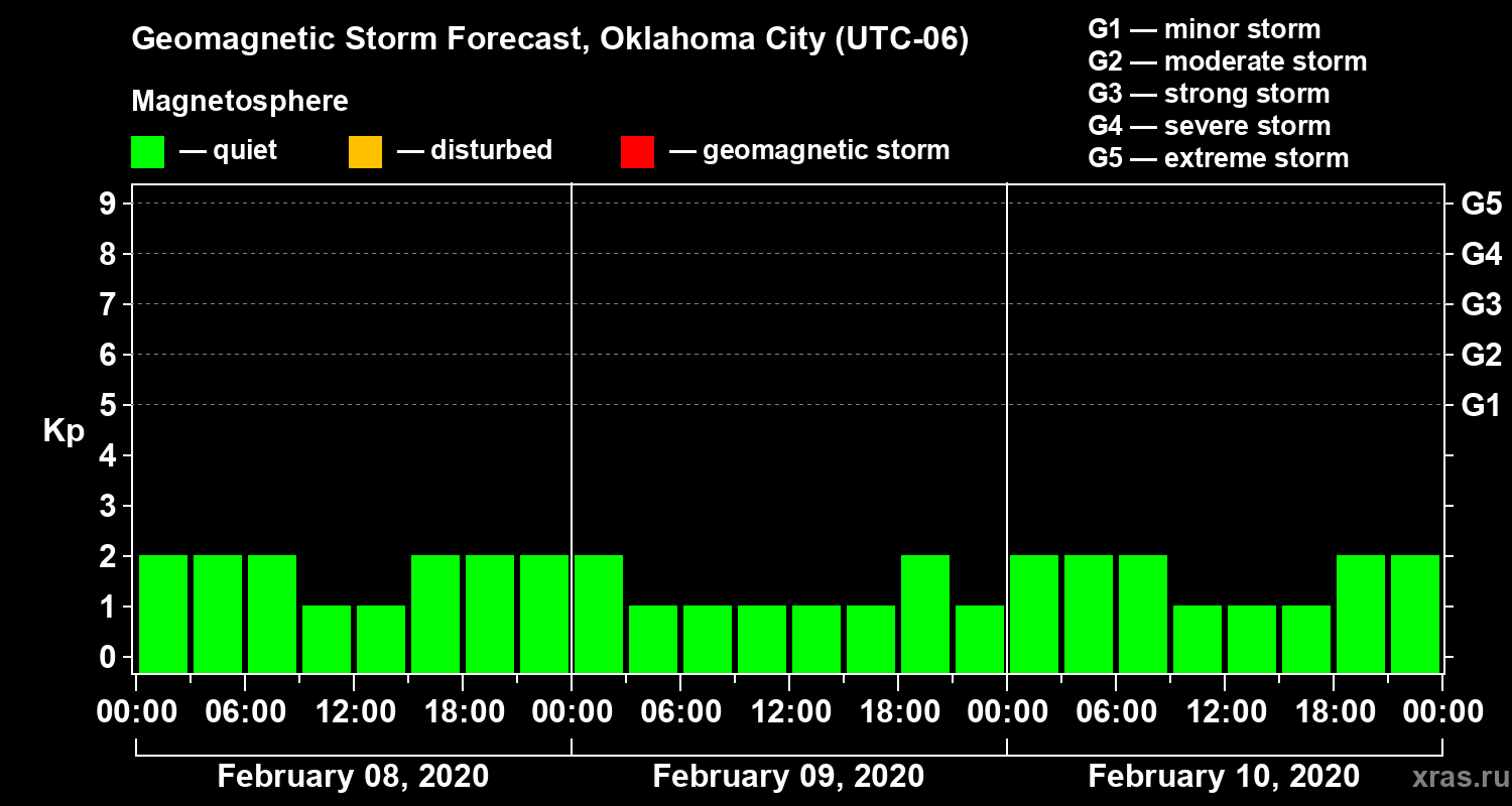 Geomagnetic storm forecast in Oklahoma City for Feb 08, 2020