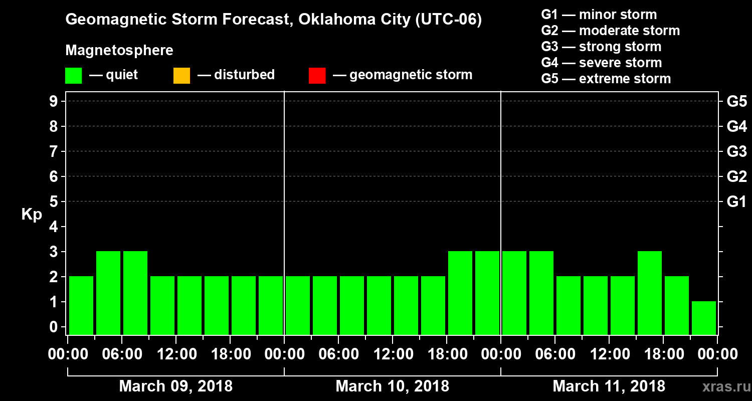 Geomagnetic storm forecast in Oklahoma City for Mar 09, 2018