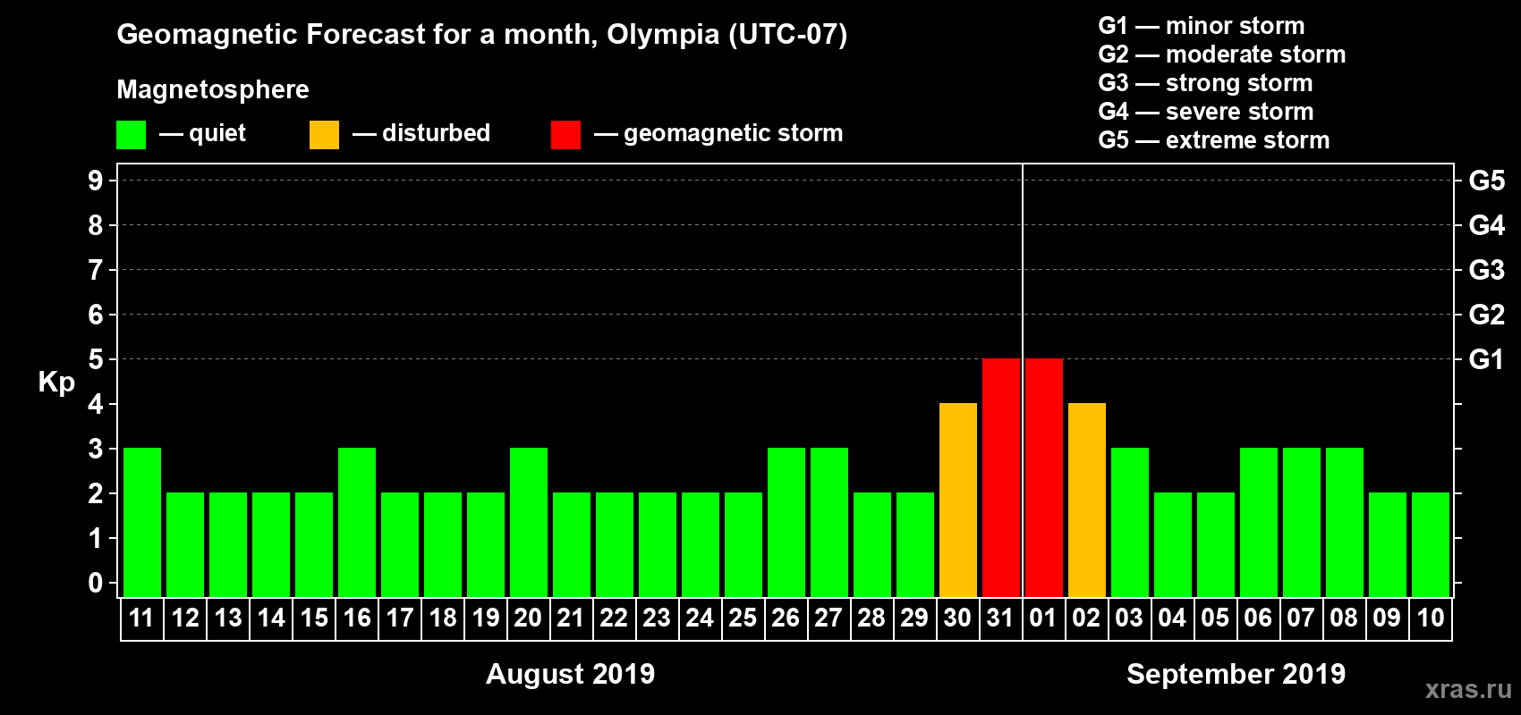 Geomagnetic storm forecast in Olympia for Aug 11, 2019