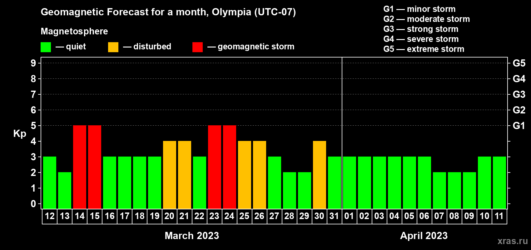 Geomagnetic storm forecast in Olympia for Mar 12, 2023