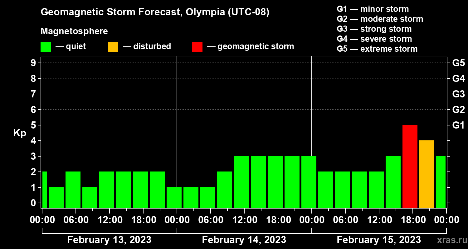 Geomagnetic storm forecast in Olympia for Feb 13, 2023