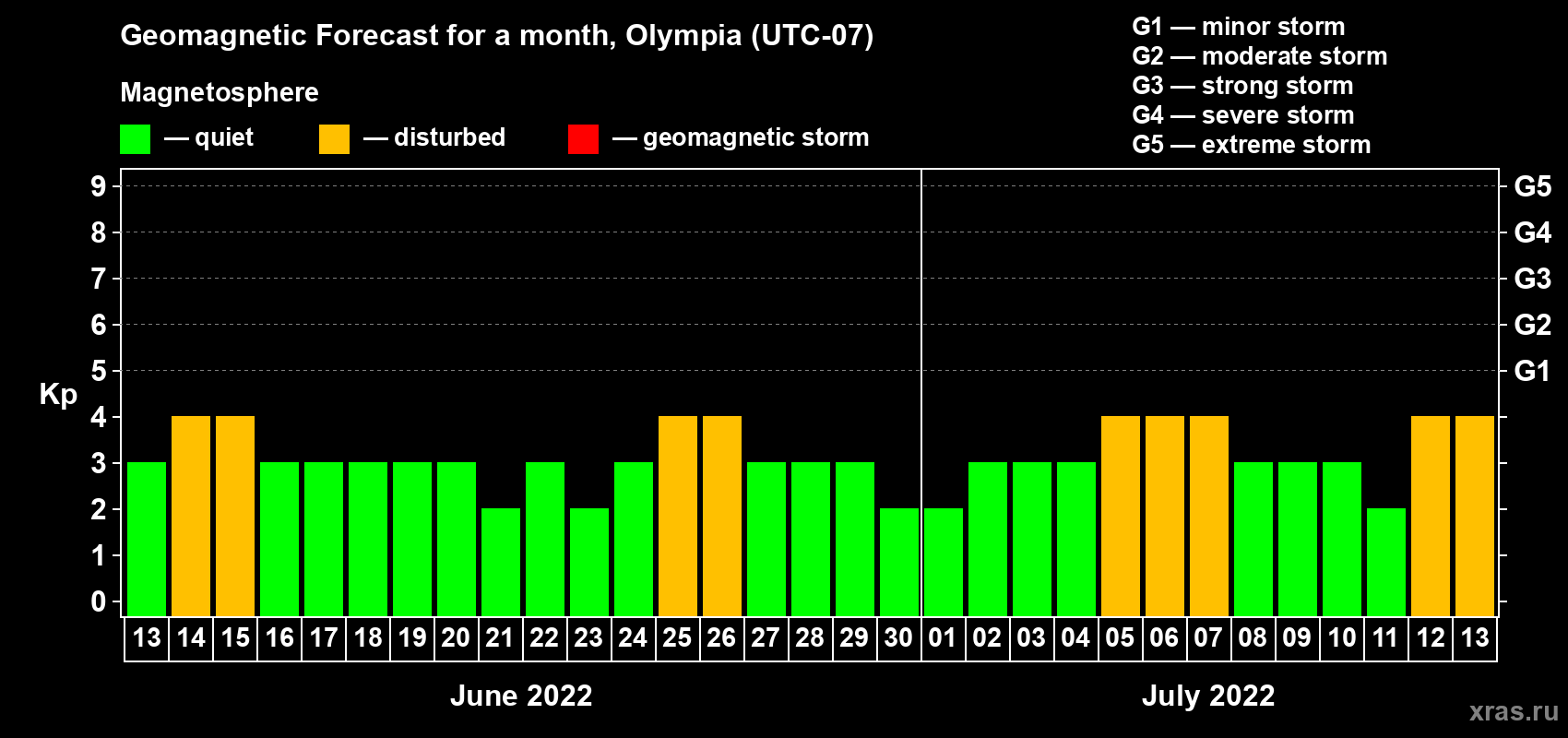 Geomagnetic storm forecast in Olympia for Jun 13, 2022