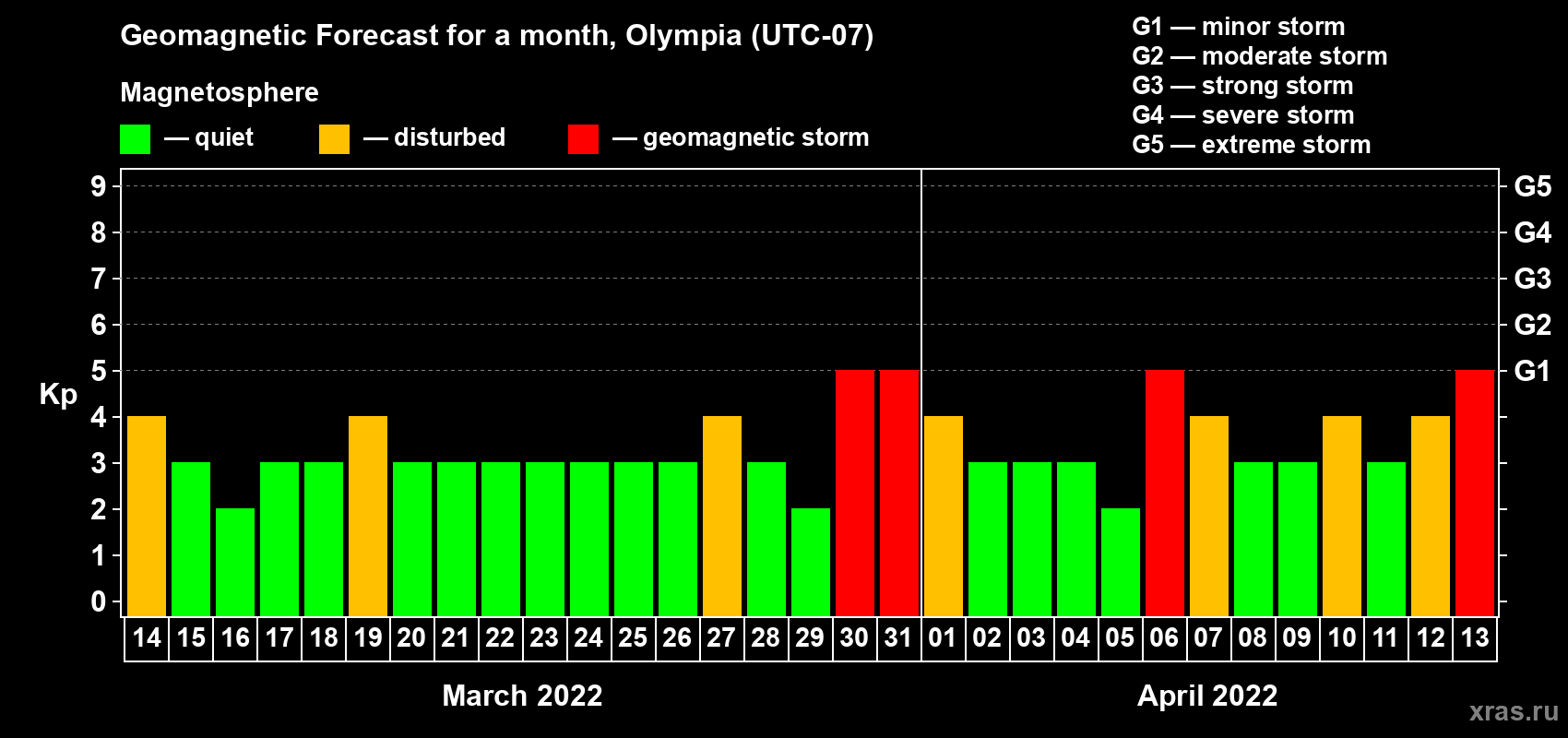 Geomagnetic storm forecast in Olympia for Mar 14, 2022