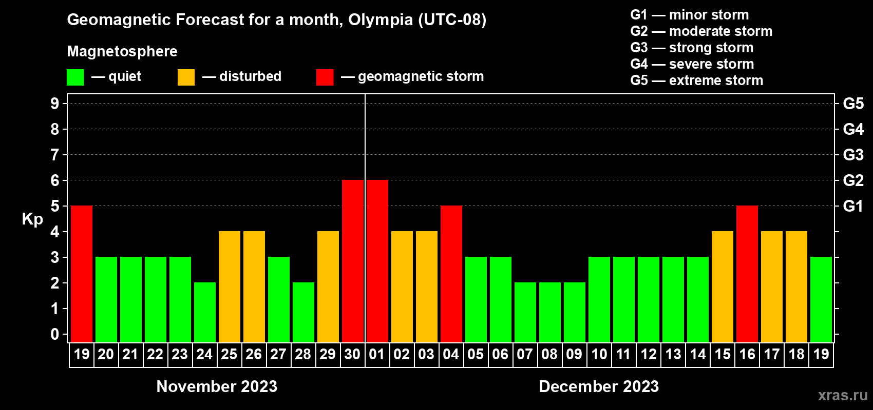 Geomagnetic storm forecast in Olympia for Nov 19, 2023