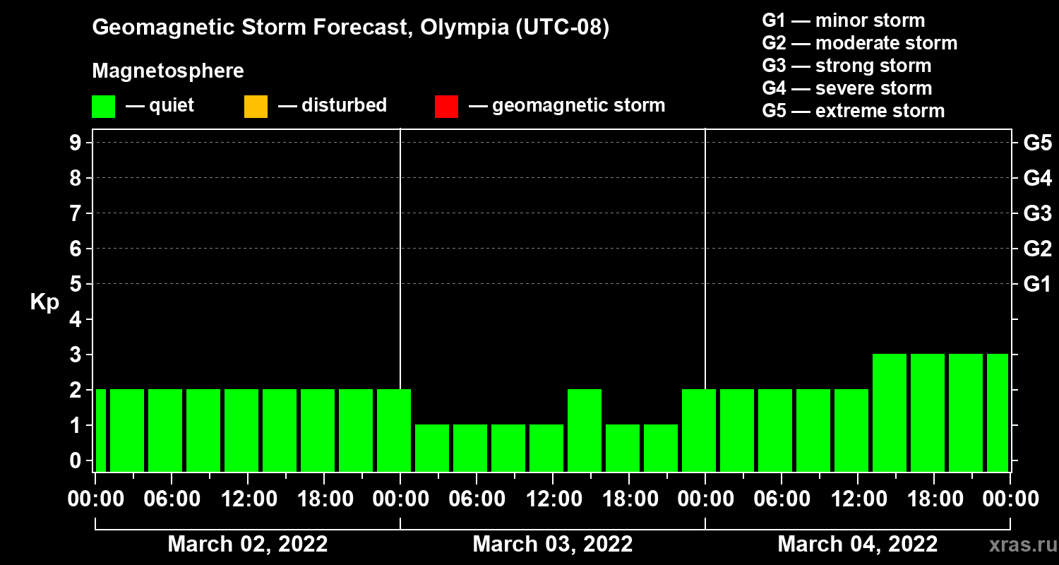 Geomagnetic storm forecast in Olympia for Mar 02, 2022