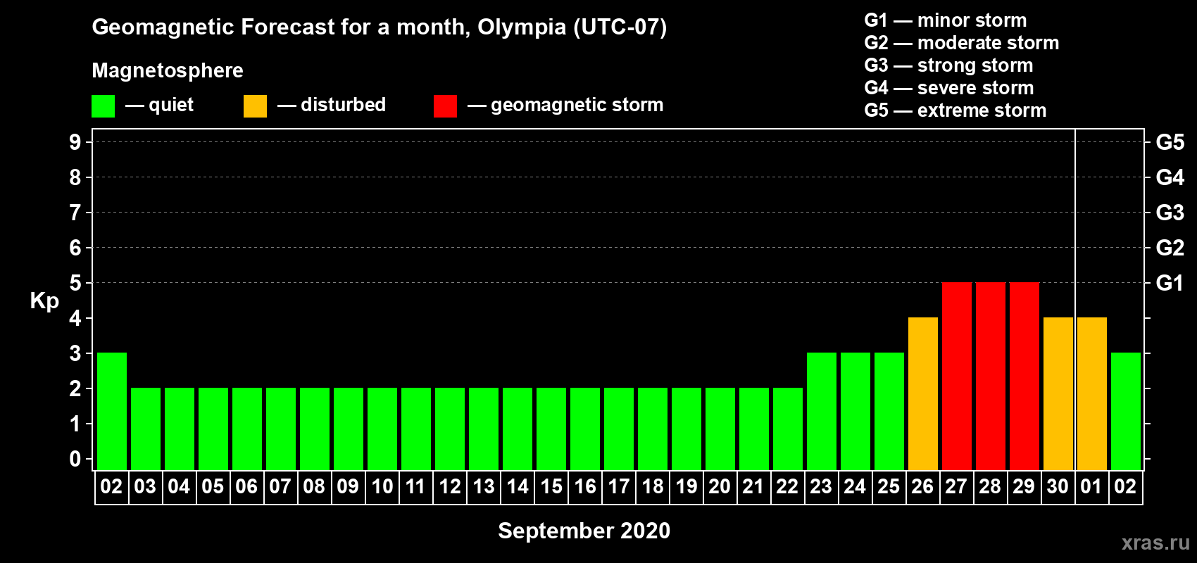 Geomagnetic storm forecast in Olympia for Sep 02, 2020