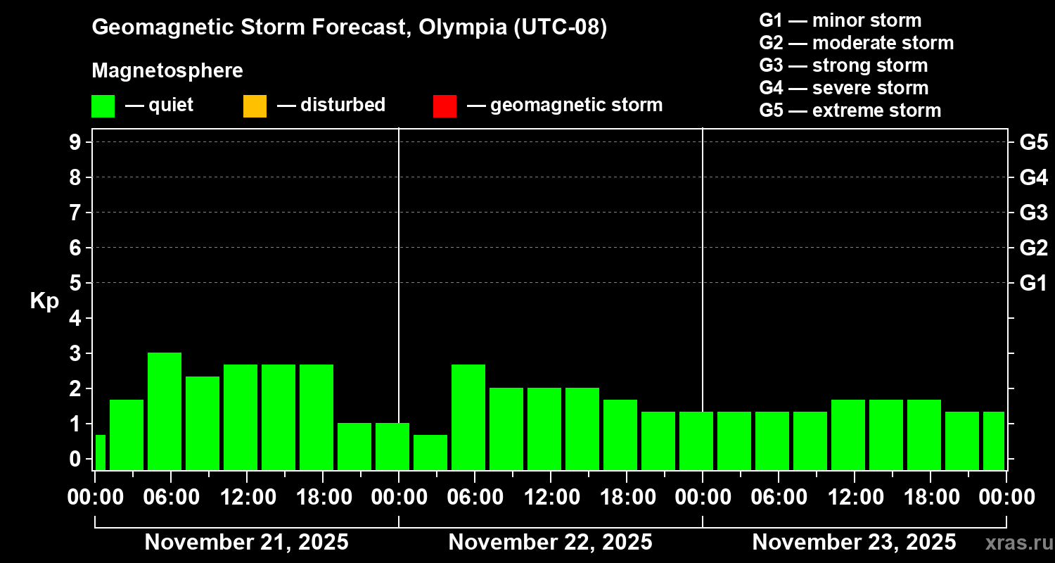 Geomagnetic storm forecast in Olympia for Nov 21, 2025