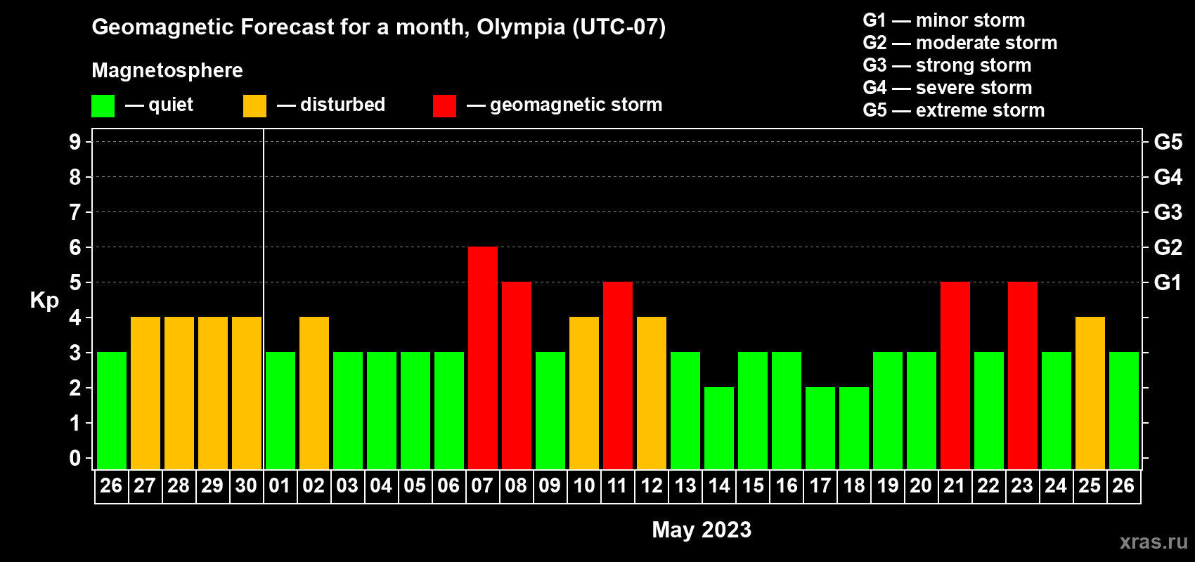 Geomagnetic storm forecast in Olympia for Apr 26, 2023