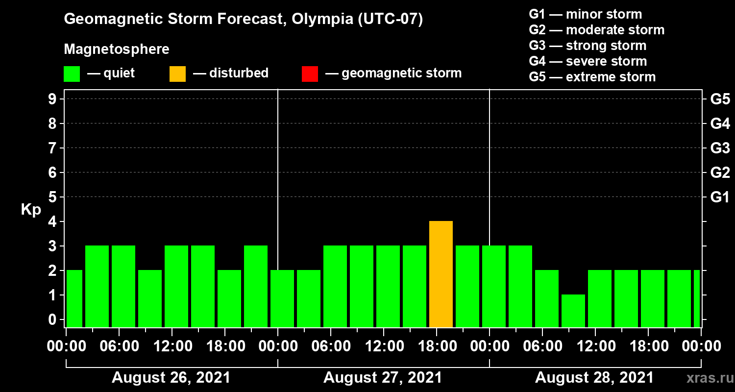 Geomagnetic storm forecast in Olympia for Aug 26, 2021