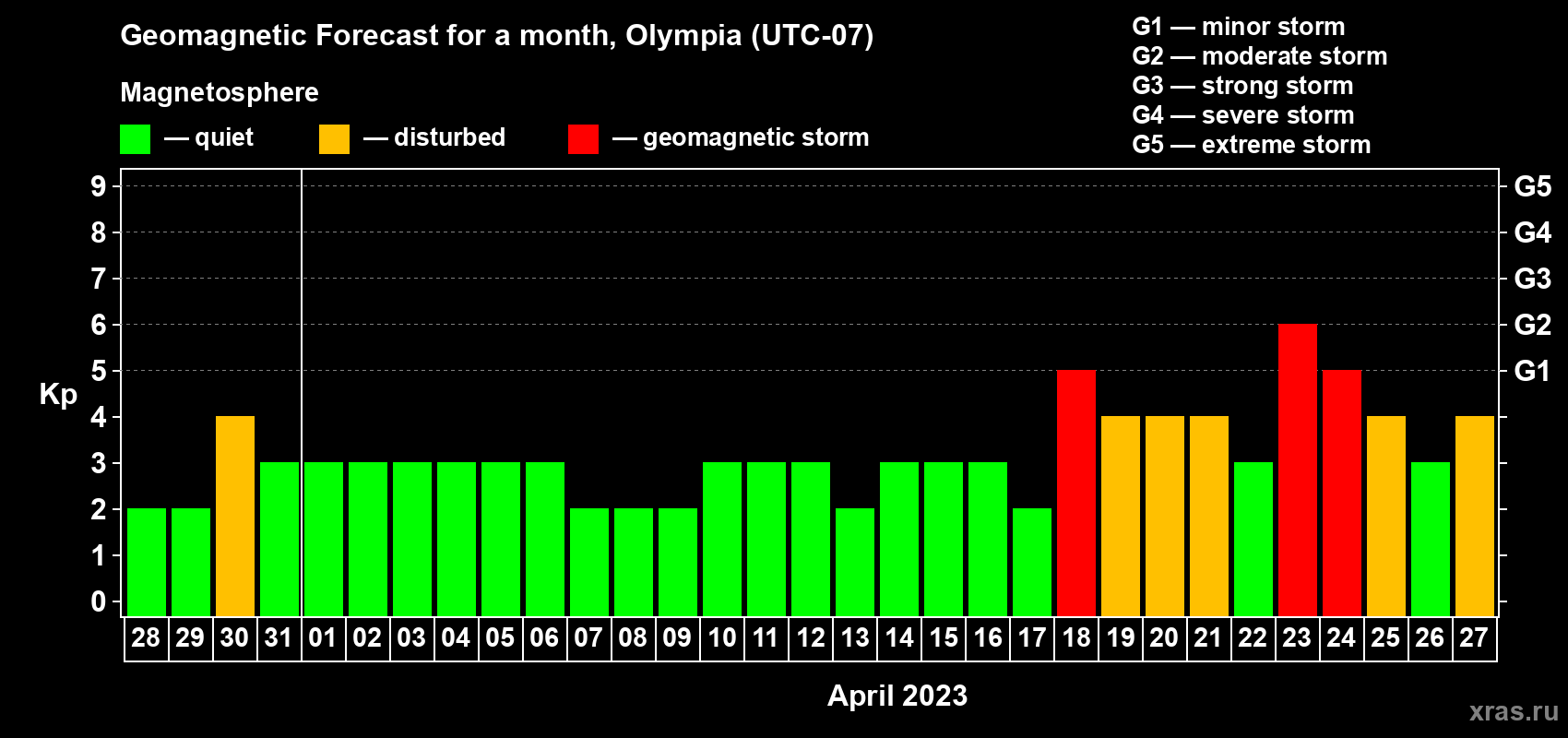 Geomagnetic storm forecast in Olympia for Mar 28, 2023