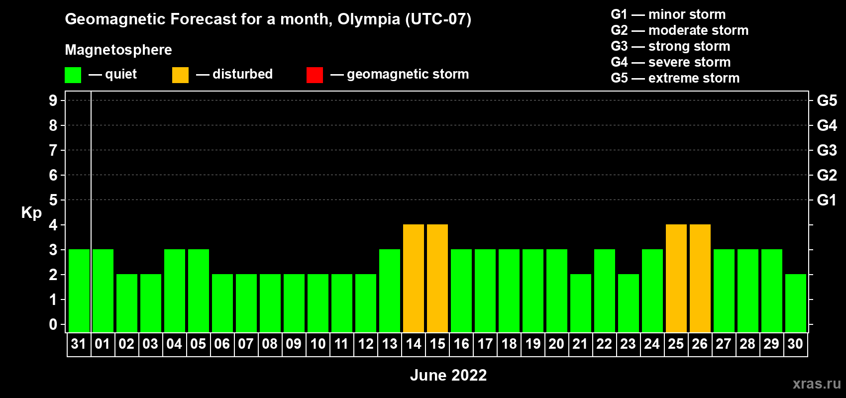 Geomagnetic activity forecast in Olympia — May 31, 2022